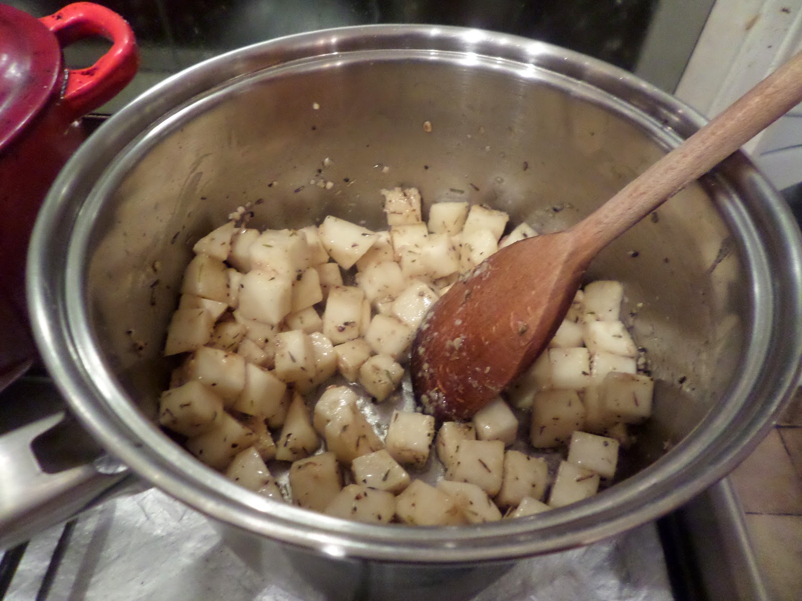 Finally there’s the celeriac, so I’m going to go with Jamie’s smashed celeriac. Cube the celeriac, season, fry up in olive oil (it’s Jamie…), thyme & garlic, then add a few Tbsp of water, cover and simmer for 25 minutes. Then smash before serving.