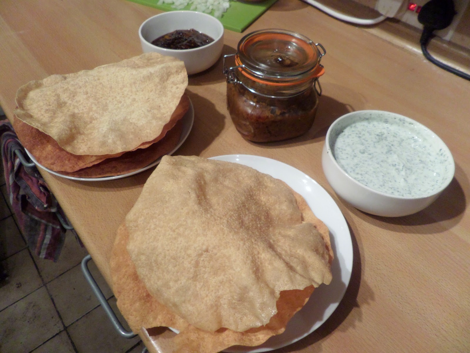 For starters we’ll do poppadoms. Poppadoms always come with four dips, but one is always an onion salad that you can’t really dip and you end up glueing to the poppadoms with other dips, so we’re just doing a mango chutney, mint & yogurt sauce, plus the lime pickle we made earlier this year.