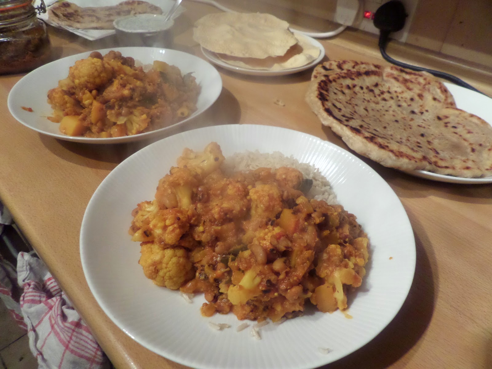 ANd serve with Soph’s butternut squash & cauliflower curry, Soph’s raita, lime pickle, and microwaved poppadoms.