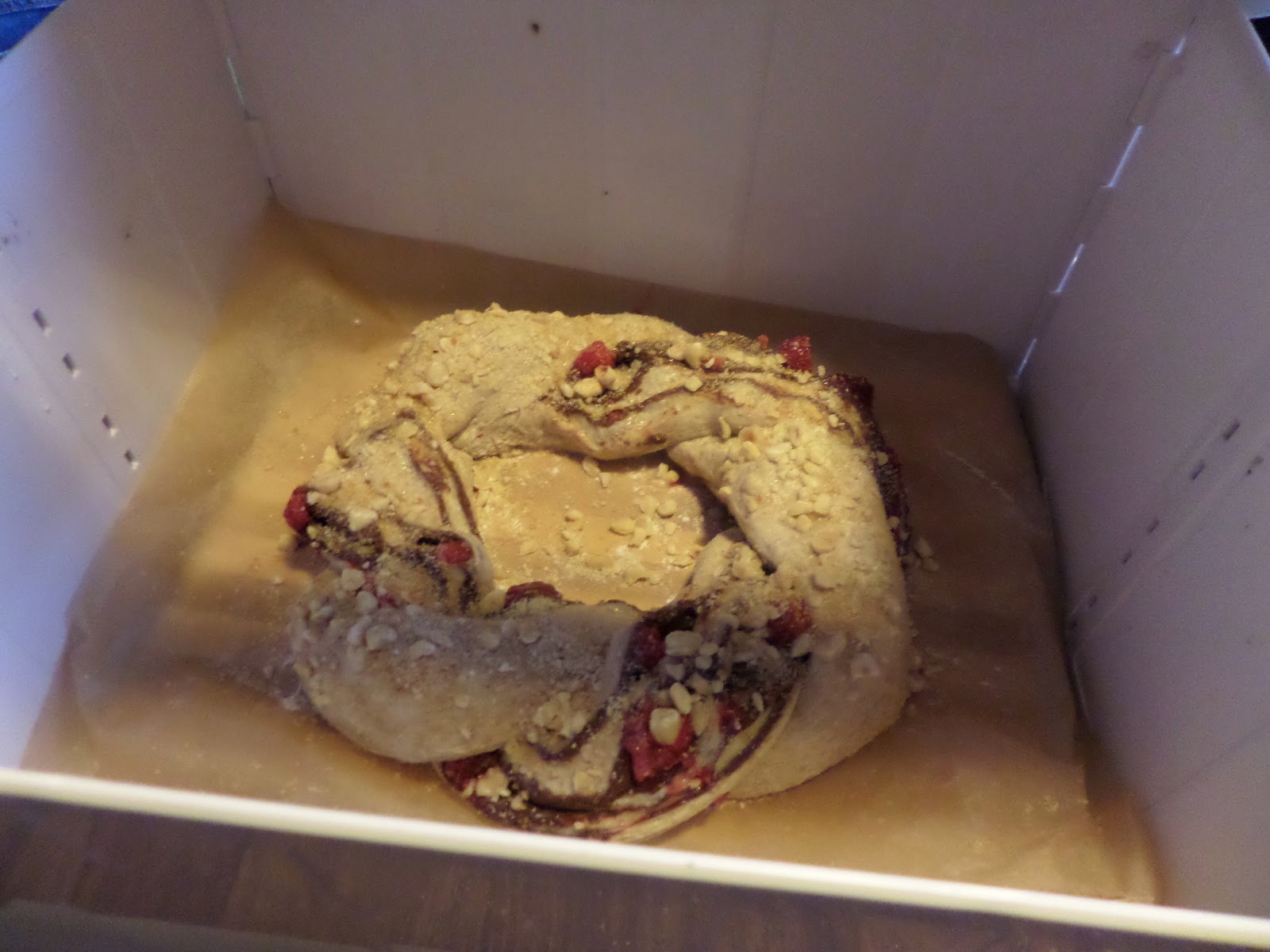 You then twist up the two parts and shape into the crown. Your then meanT to top with crushed hazelnuts and demerara sugar. Easier said than done as they don’t want to stick to the bread parts… so I used a milk wash which helped. Not sure anything will stay on after baking…