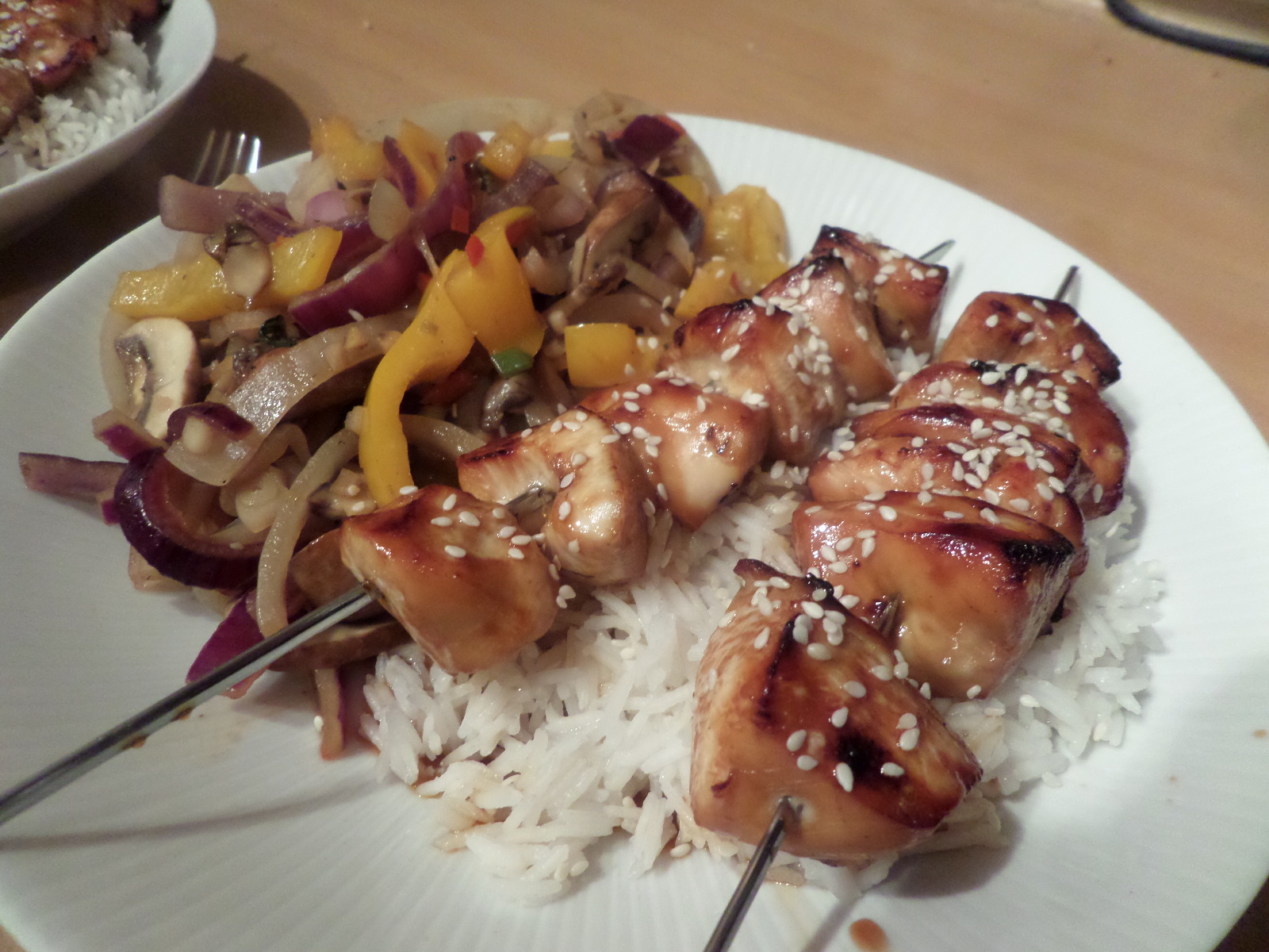 Nothing too complicated: which is the whole point given it’s a midweek meal. Just chicken skewers, stirfry veg and rice. However unlike the last time we did this we’ll be making our own yakitori sauce, based on this recipe from Wagamama.