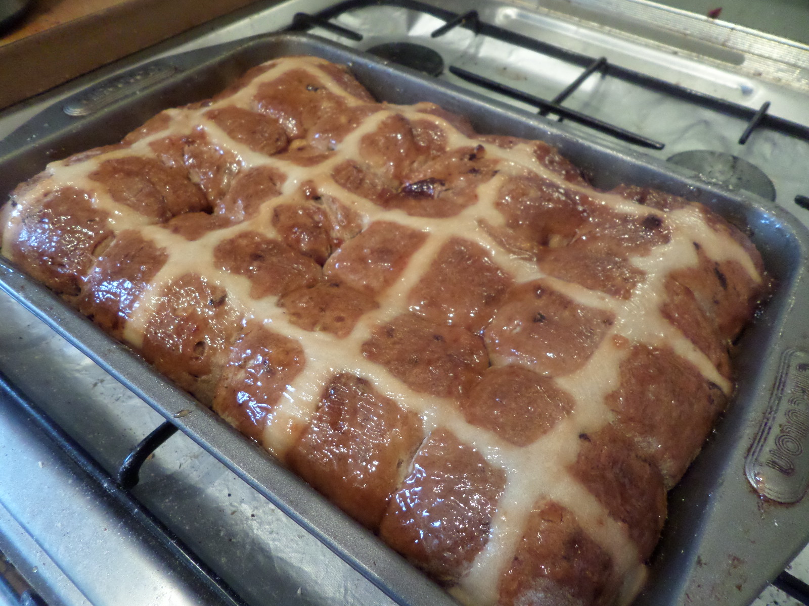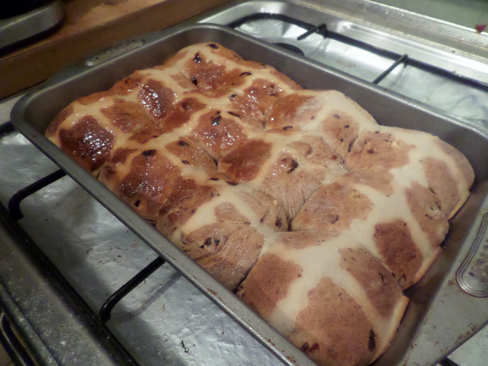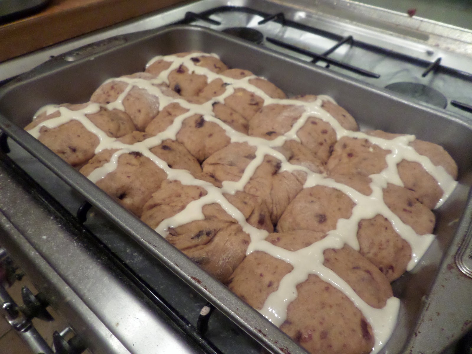 Anyway: make into buns, proof in the top oven while the the main oven heats up. Then cross them.