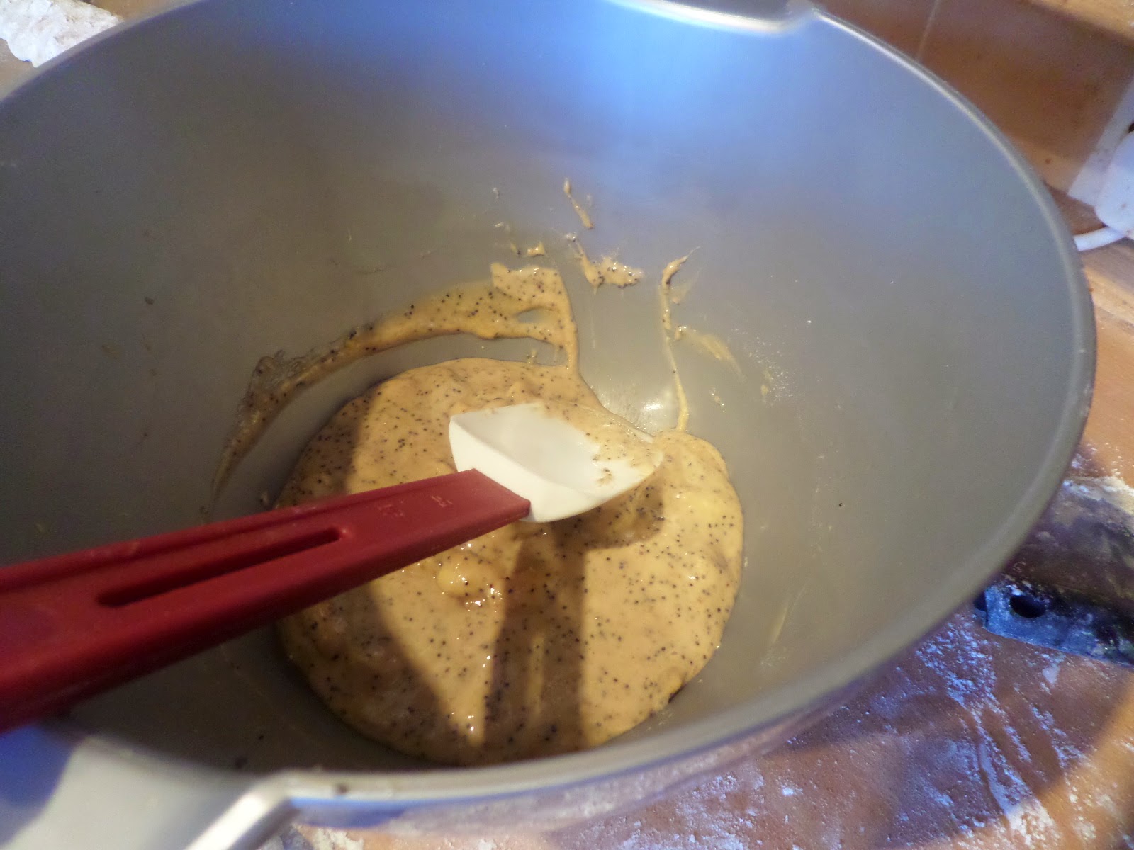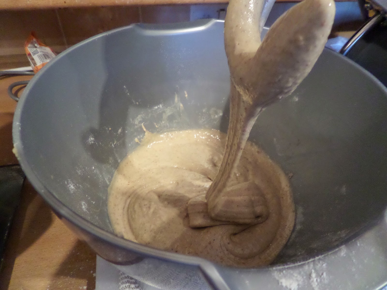 This all gets mixed together in the stand mixer, which as before starts out looking impossibly dry… then ends up being a really sticky dough. In fact runnier than I remember, hmm…