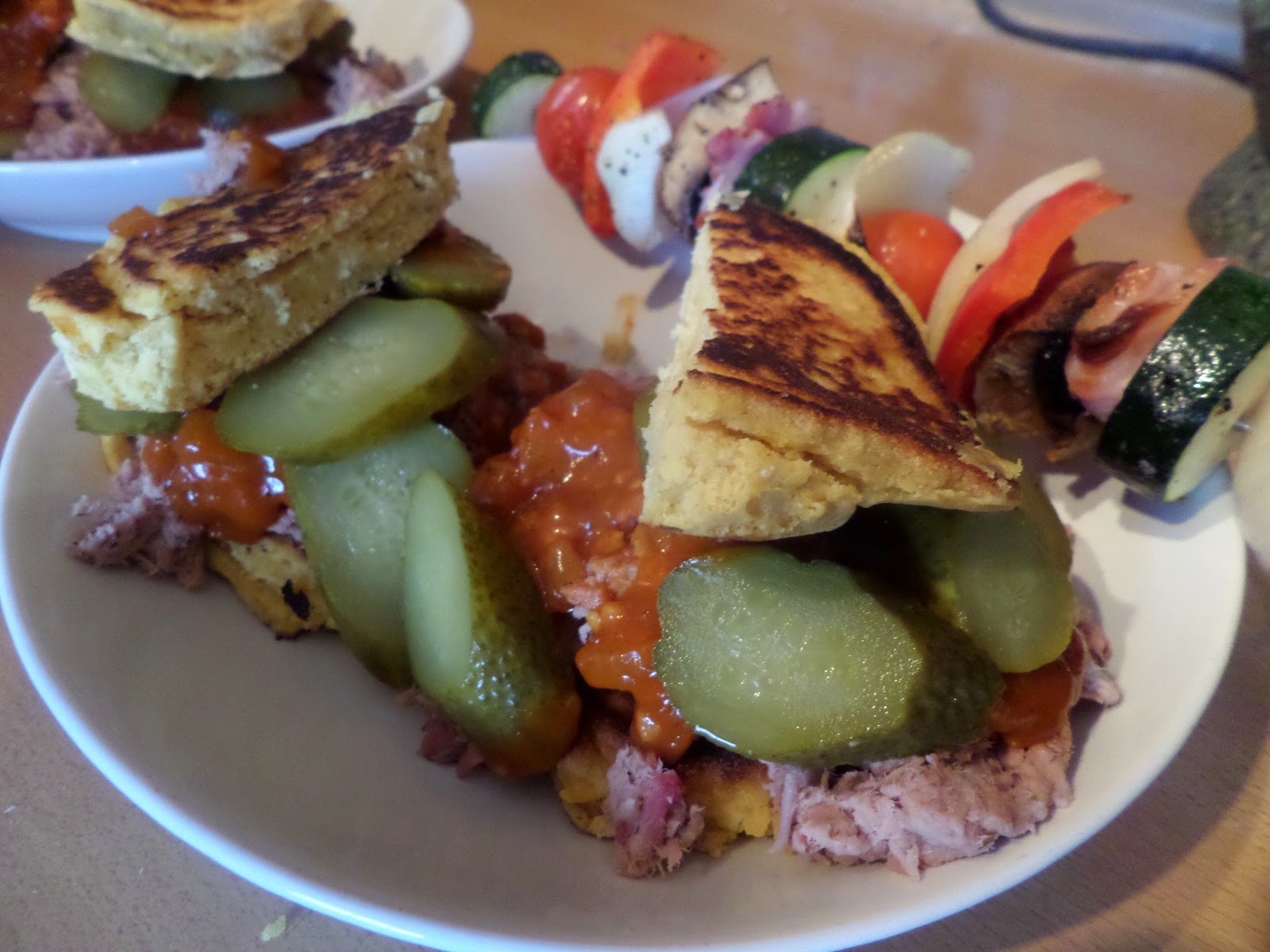 Pulled pork is of course delicious, and it works really well with the hoecakes. We’ll certainly do this again: especially as we’ve got the leftover pulled pork and BBQ sauce in the freezer!
