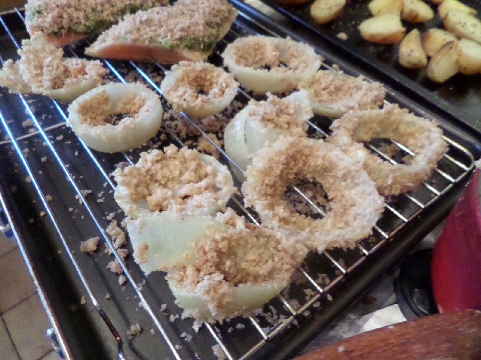 Onions rings… aren’t normally part of fish & chips, but while we were working out this morning we watched an episode of Cook’s Country where they did onion rings, so I can’t resist adding them to the menu. Unlike the ones one the show which were deep fried in batter, ours will be breadcrumbed and oven baked.