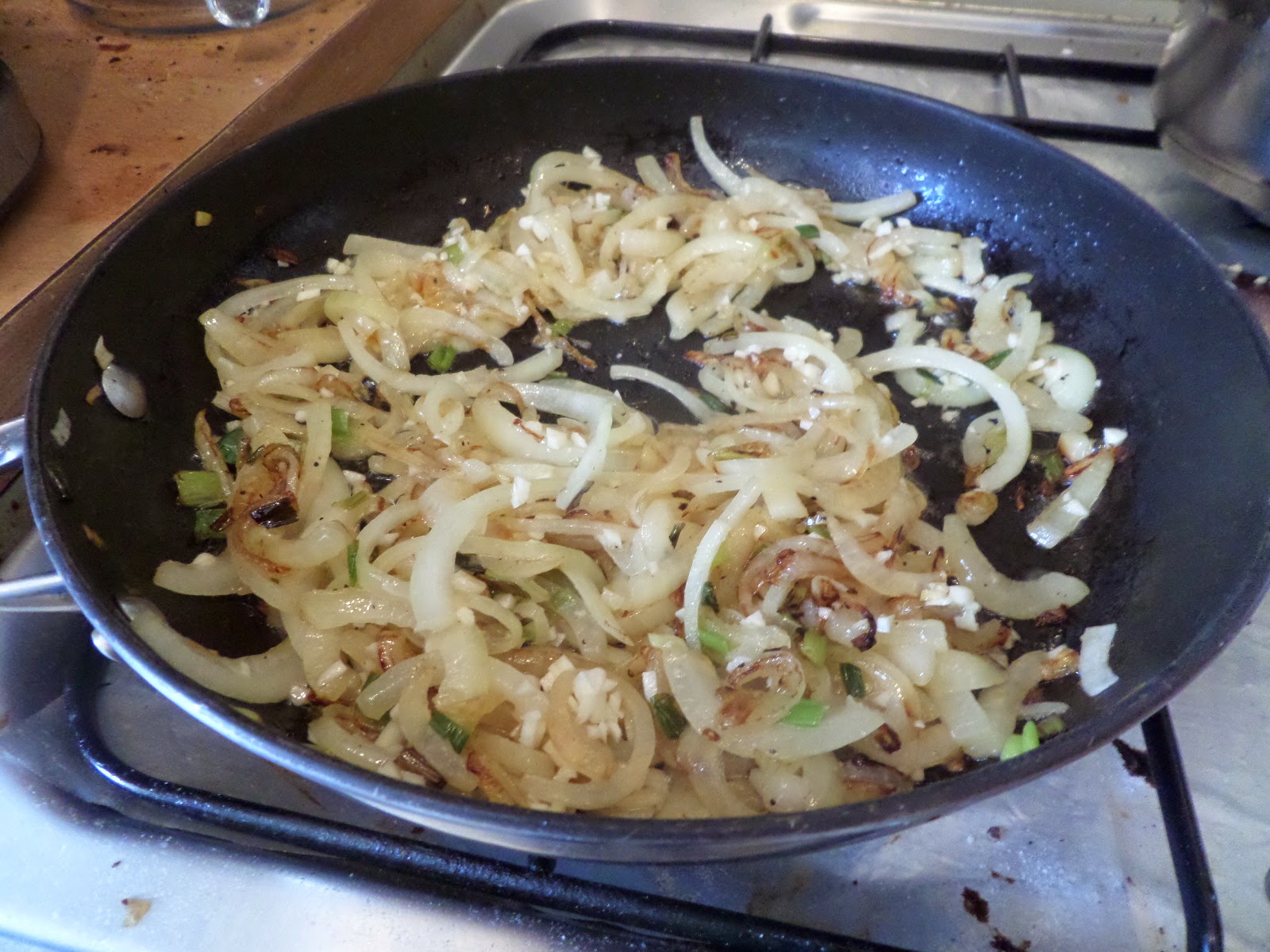 Things start with boiling up rice, then caramelising onions, then adding chopped garlic.