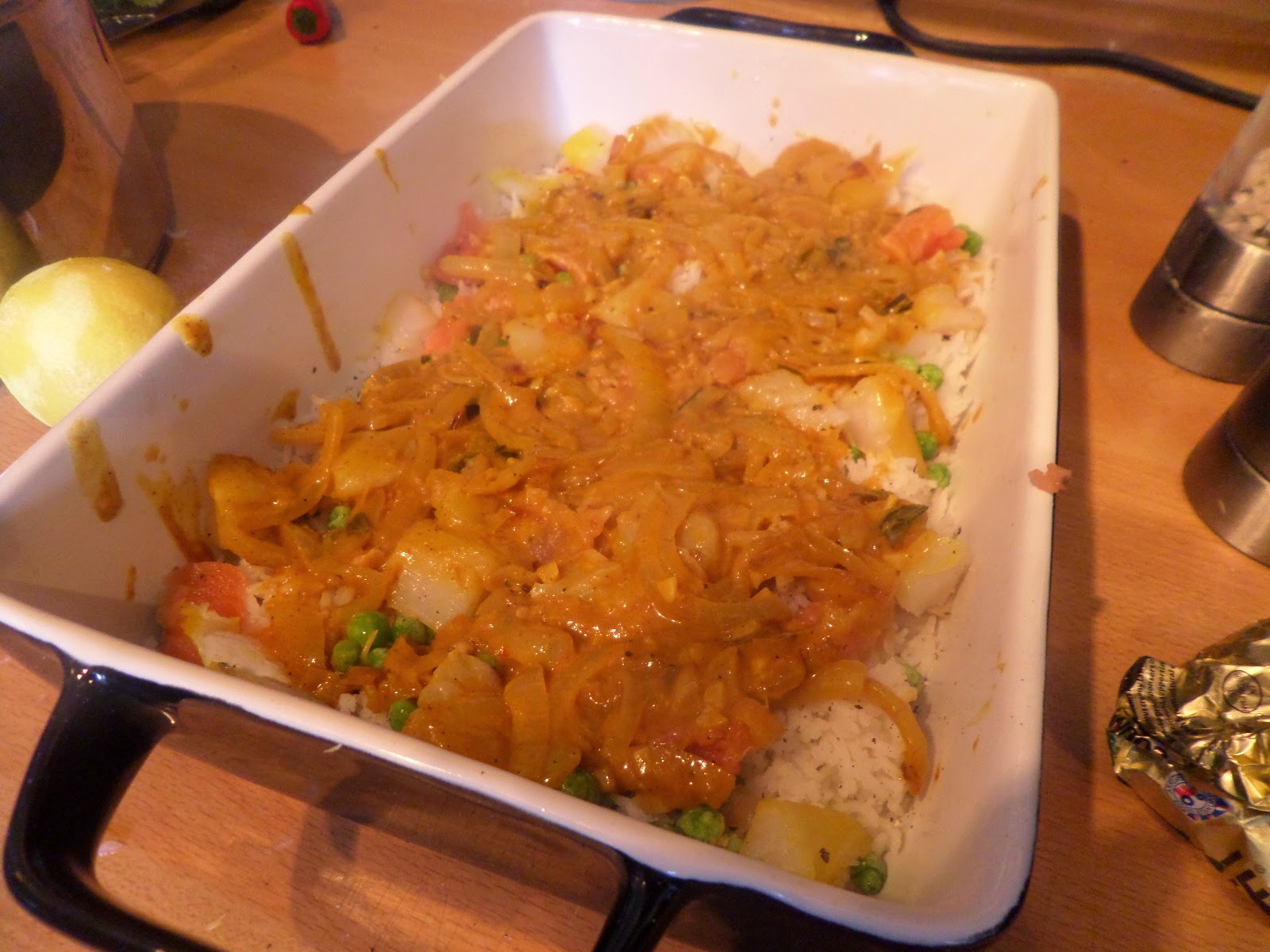 The dish is assembled in layers: rice, peas, fish, season, sauce, repeat. Due to things lying around in the fridge we’ve added from squid and salmon to the haddock and prawns in the recipe.