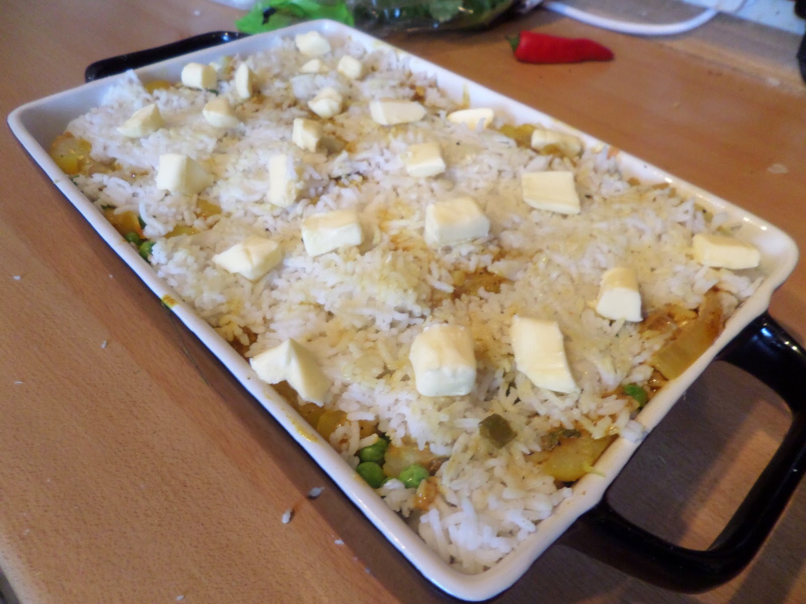 The top layer is rice, with butter dotted on top.