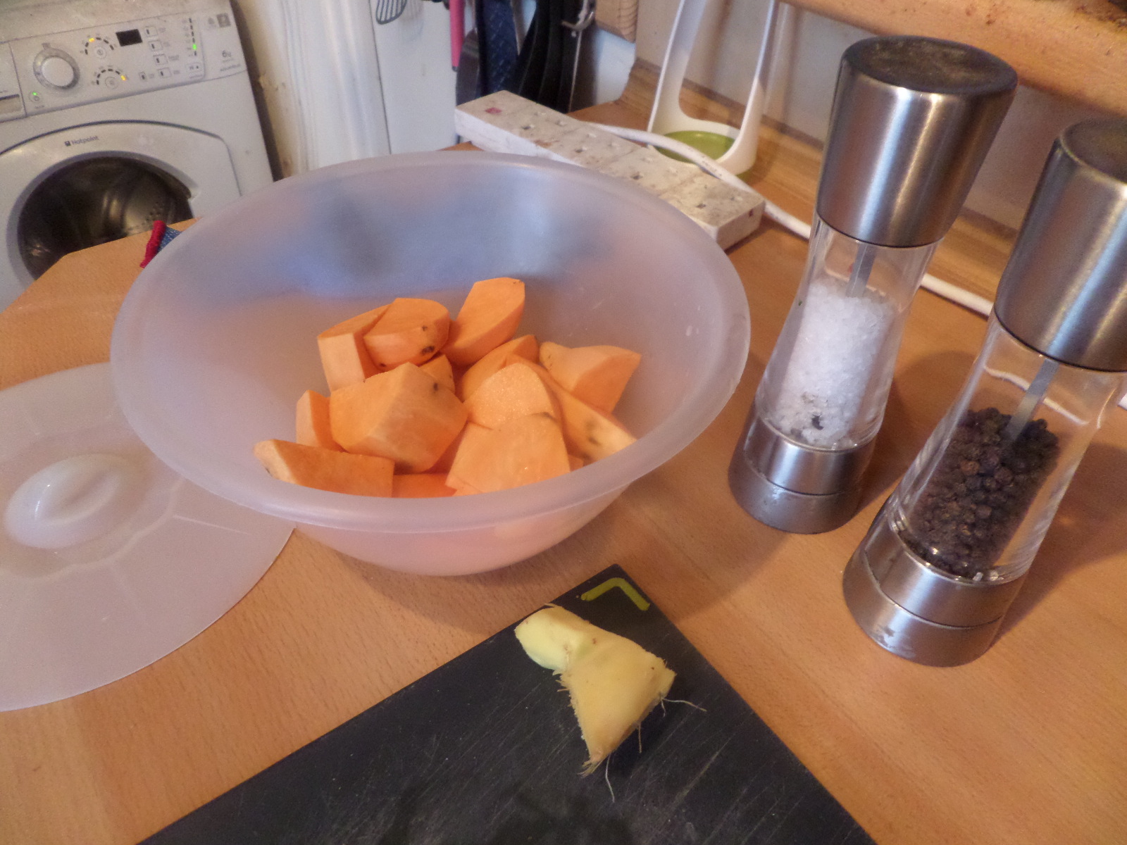 Sweet potato gets microwaved then mashed with butter, ginger, ground coriander & cumin, plus seasoning.