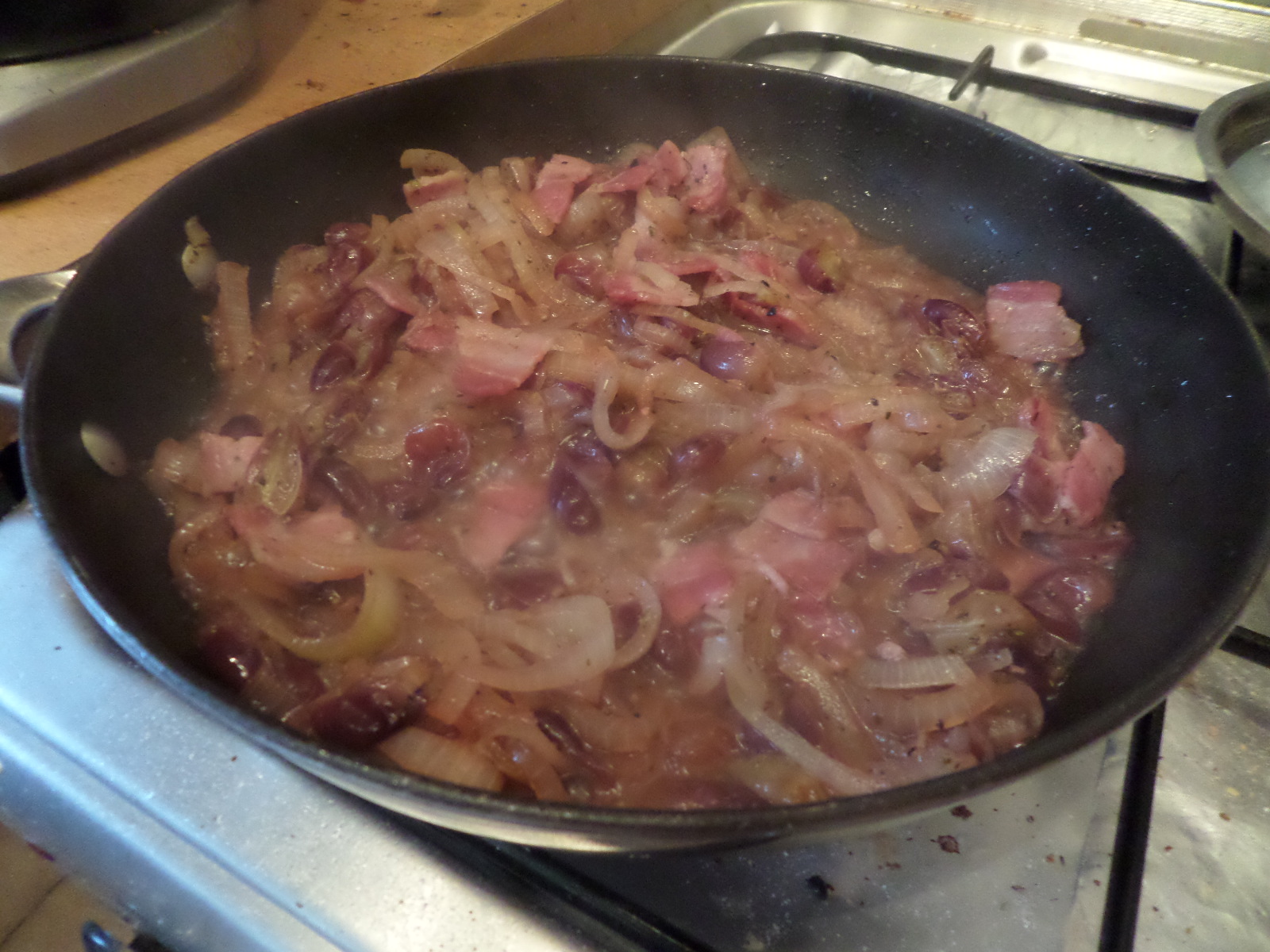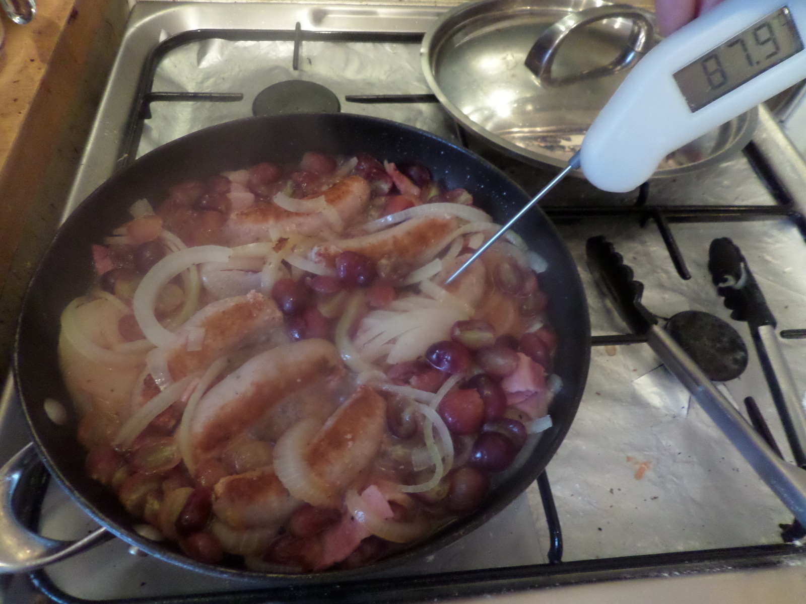 One interesting feature of the cooking method is how the sausages get fried. I’ve never managed to fry sausages properly, as you always end up with burnt bits and/or uncooked bits. I normally end up grilling/broiling, but that has similar issues. This recipe first fries off the sausages to get some nice colour, but then finishes by steaming them: add some water to the frying pan and cover to cook the sausages through. If this works, I think I’ll be cooking all sausages like this from now on!