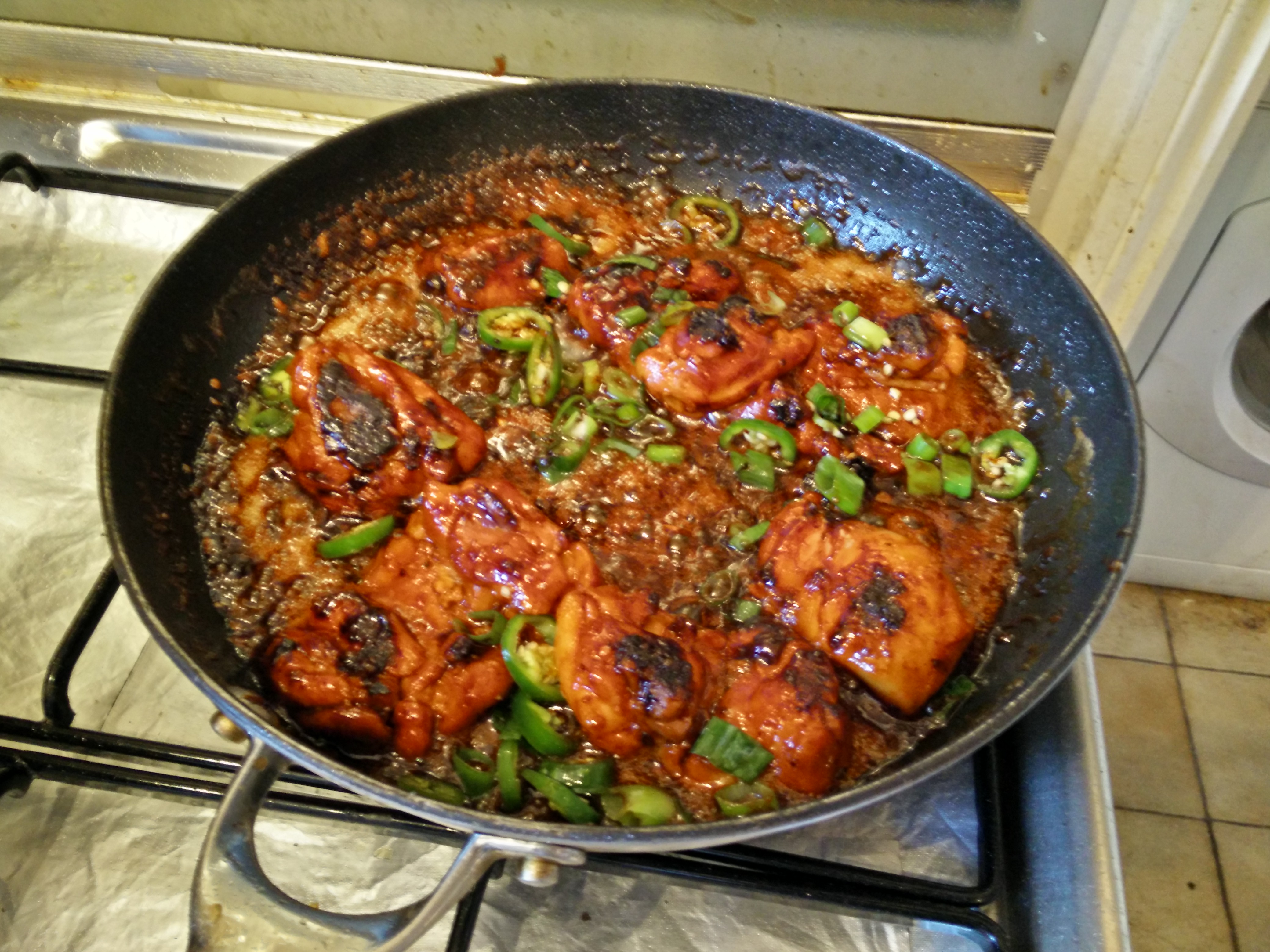 So after half an hour or so of reducing, the chicken looks ready and spring onions and sliced chillies get added.