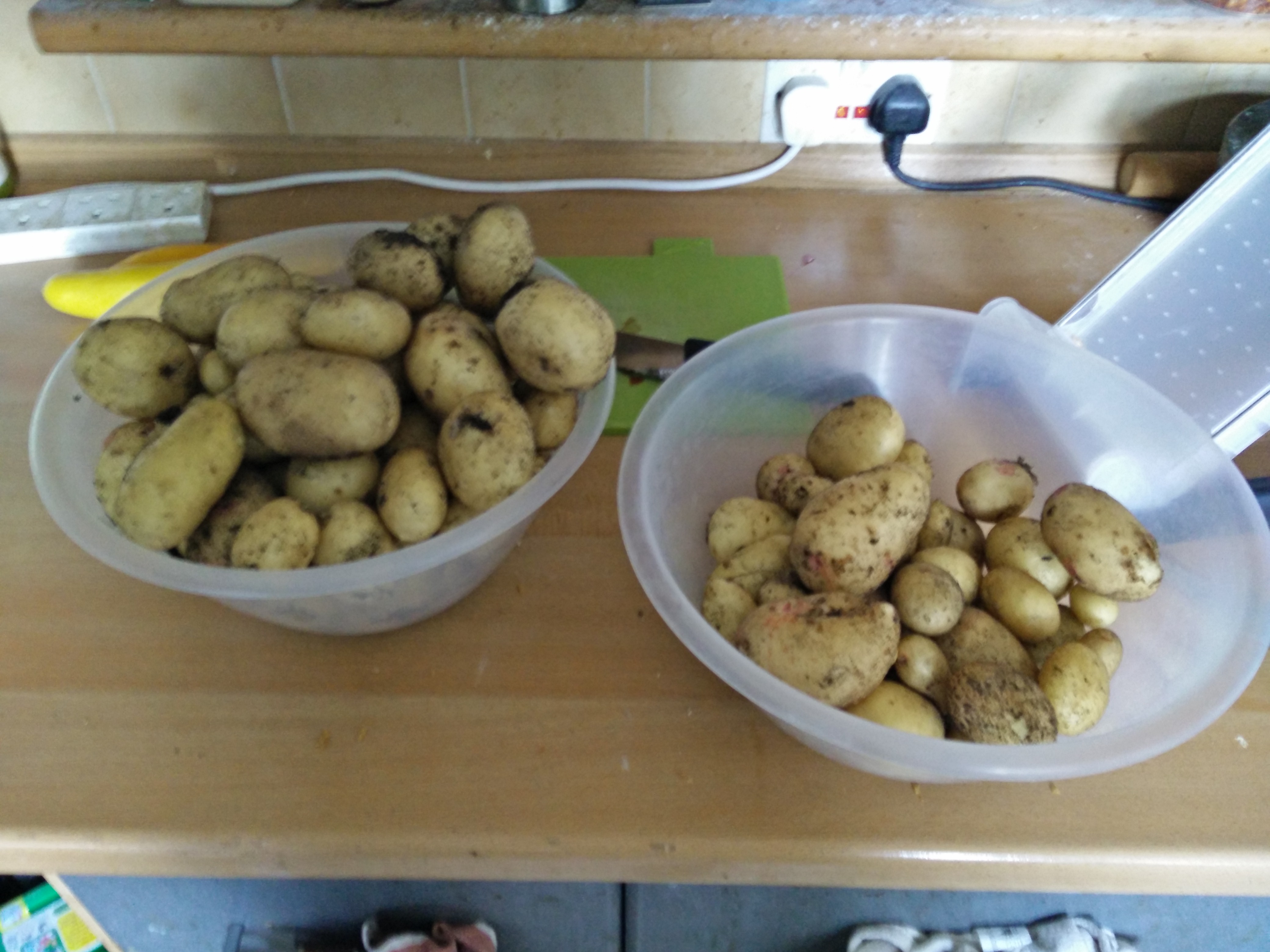 Coincidentally today was the day when I harvested this years potato crop. Unlike last year’s meager crop from grow bags, this year’s crop grown in the compost bin was much better, so I’m using those for the Greek potatoes.