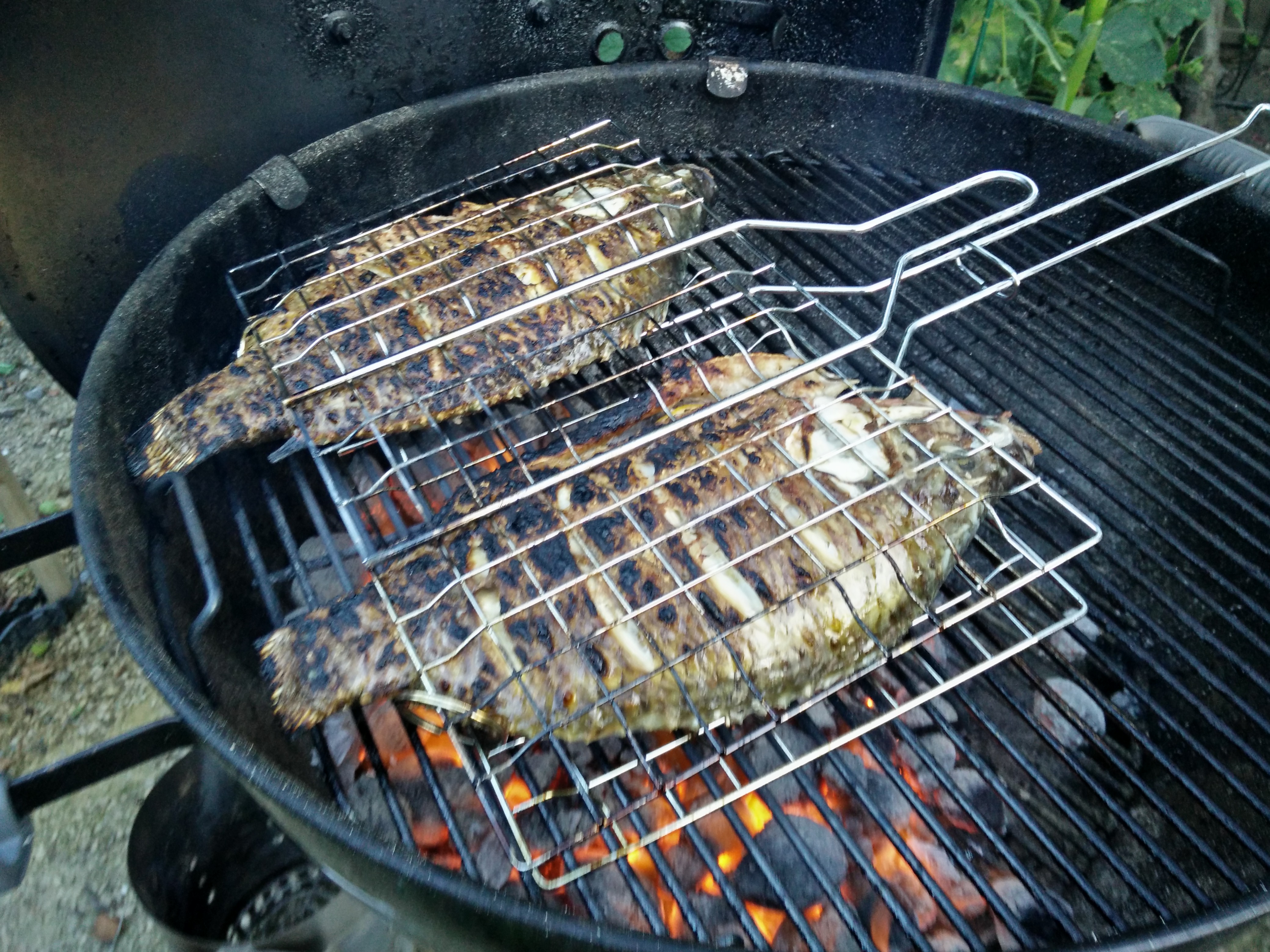 Your barbeque cage for turning the fish was handy. I’ve never come across yellow courgettes – they make a nice change. Another healthy meal.