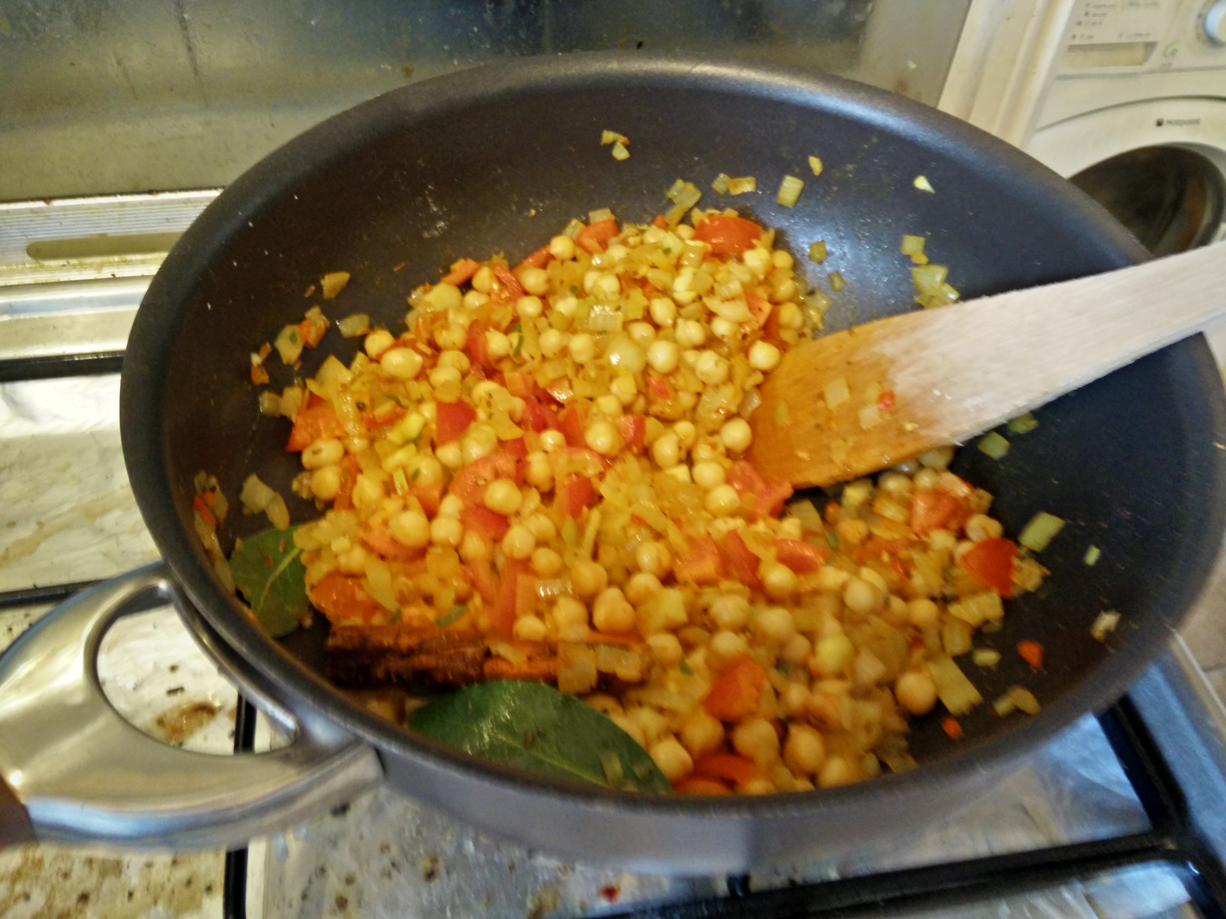 So curried chickpeas from BBC Good Food. Start by frying up onions and spices, with turmeric adding proper curry colour, then add chickpeas, tomatoes, heat through… TA DA!