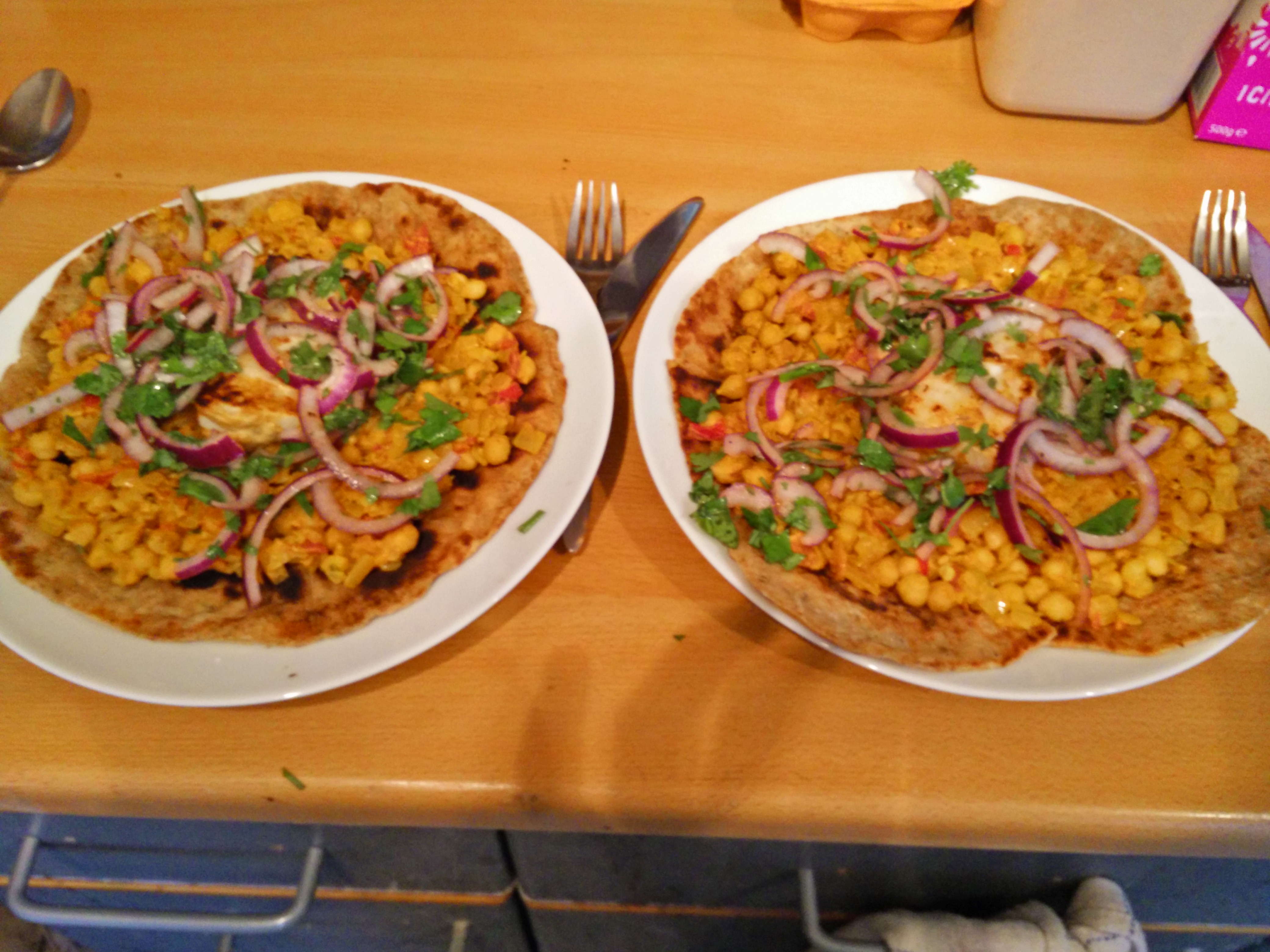 This is a great freezer, fridge and can meal. Frozen fish, frozen leftover naans, can of chickpeas, tomatoes, chillies & coriander form the fridge, add spices, onions & garlic and here’s a quick evening meal when other baking needs doing.