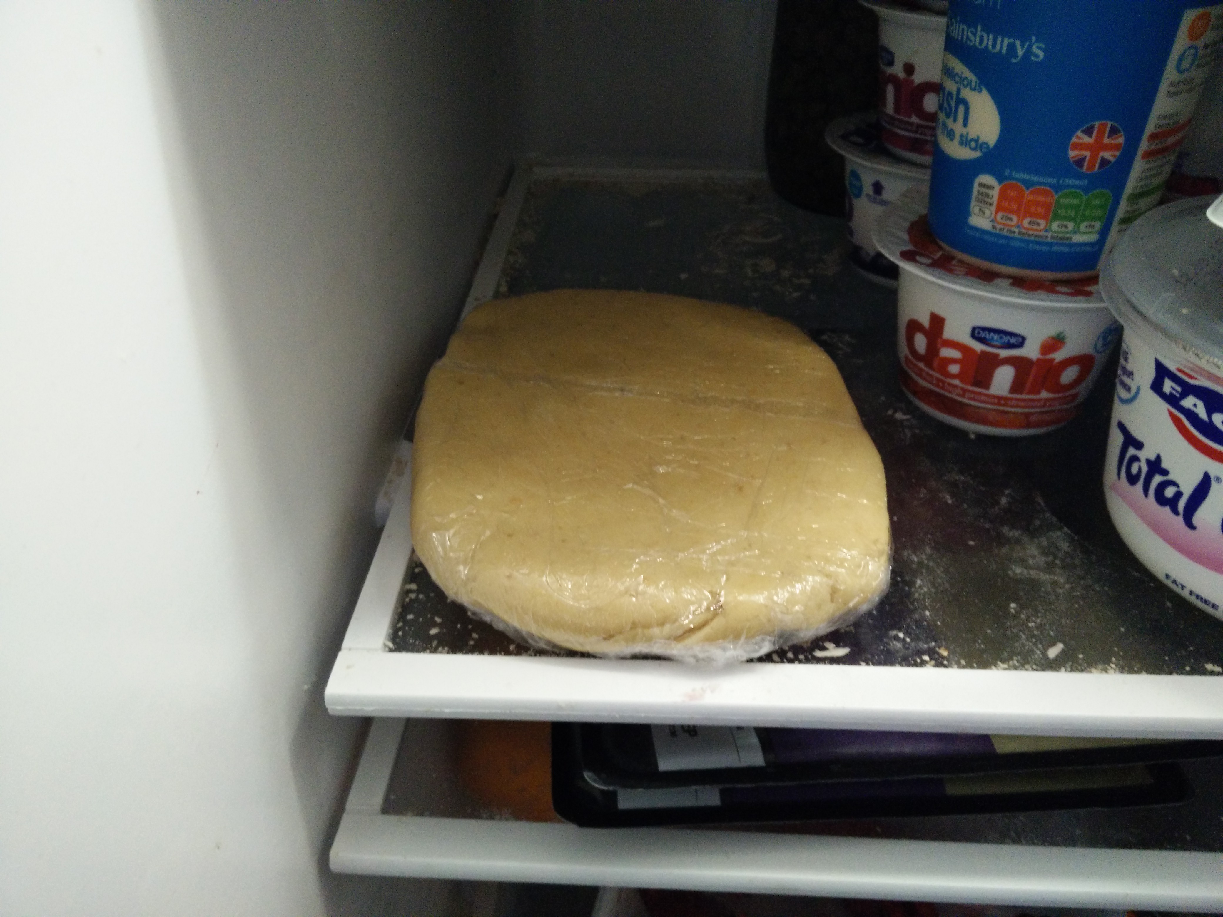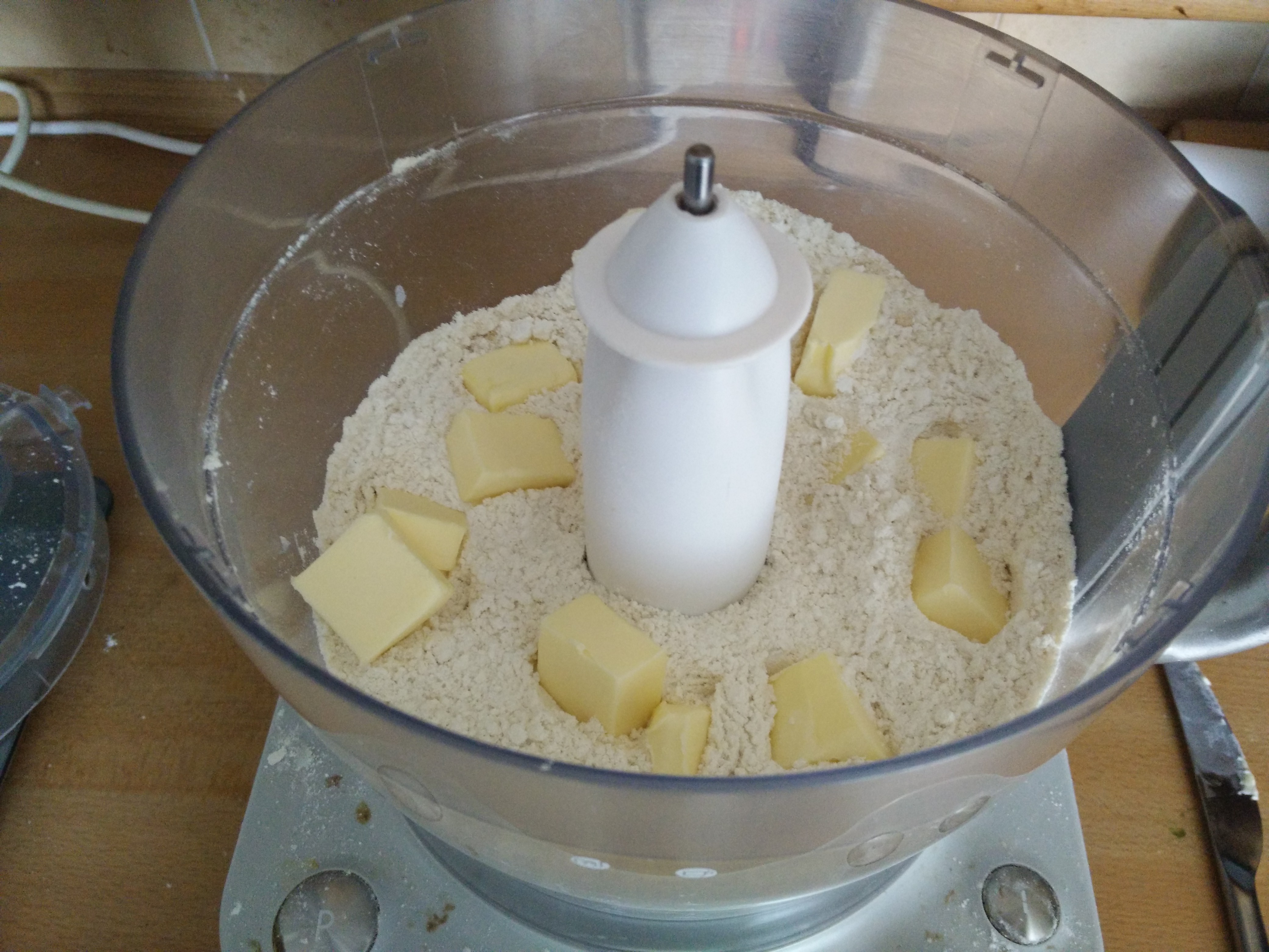 The recipe says to beat soft butter into the rest of the ingredients, but as it’s a shortbread, and I’m not sure how much starter to use in place of other liquid, I’m going to cut cold butter into the flour, then add liquids to bring it together. Also I’ll only be doing half the amount listed, as 560g flour sounds like enough for too many Toblerones!