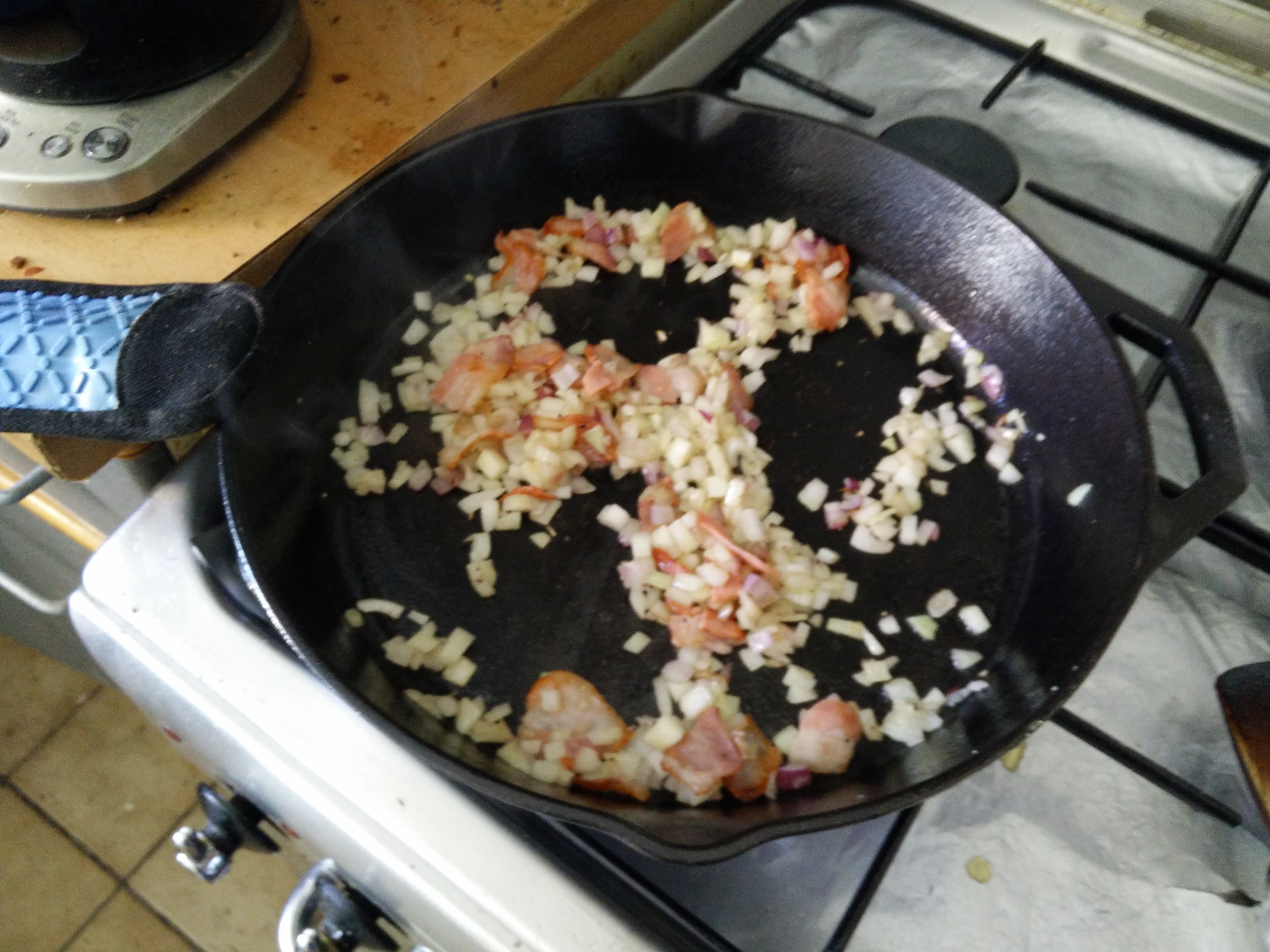 Once the bacon fat has rendered out the onions go in to soften and brown.