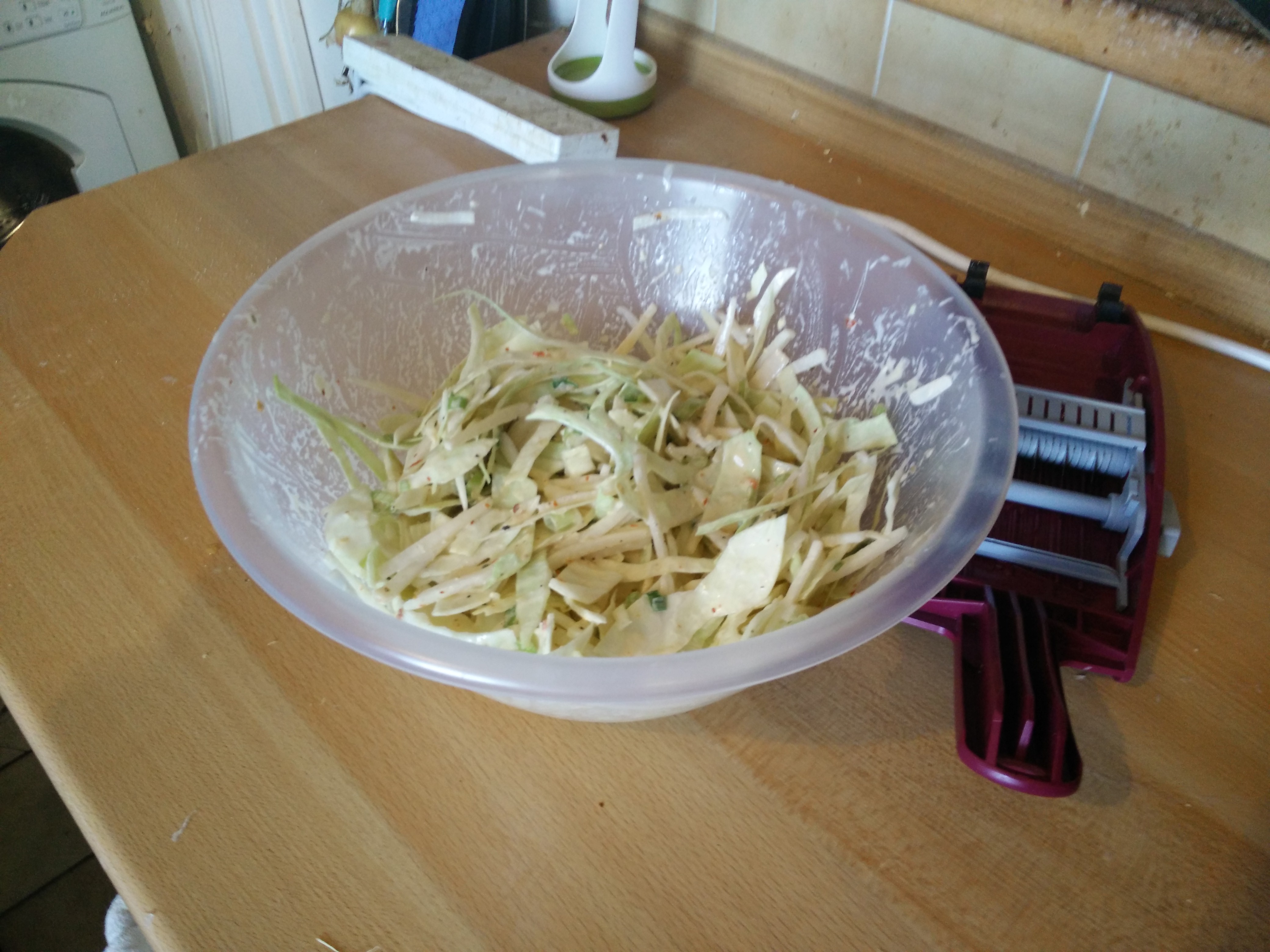 But this BBC Good Food recipe does have an interesting spicy sauce, although not with the proper Korean chilli paste. We’ll be replacing that with hot pepper sauce and sugar. And it does have an interesting kimchi-style slaw, and we did manage to get a mooli (daikon) to go in it.