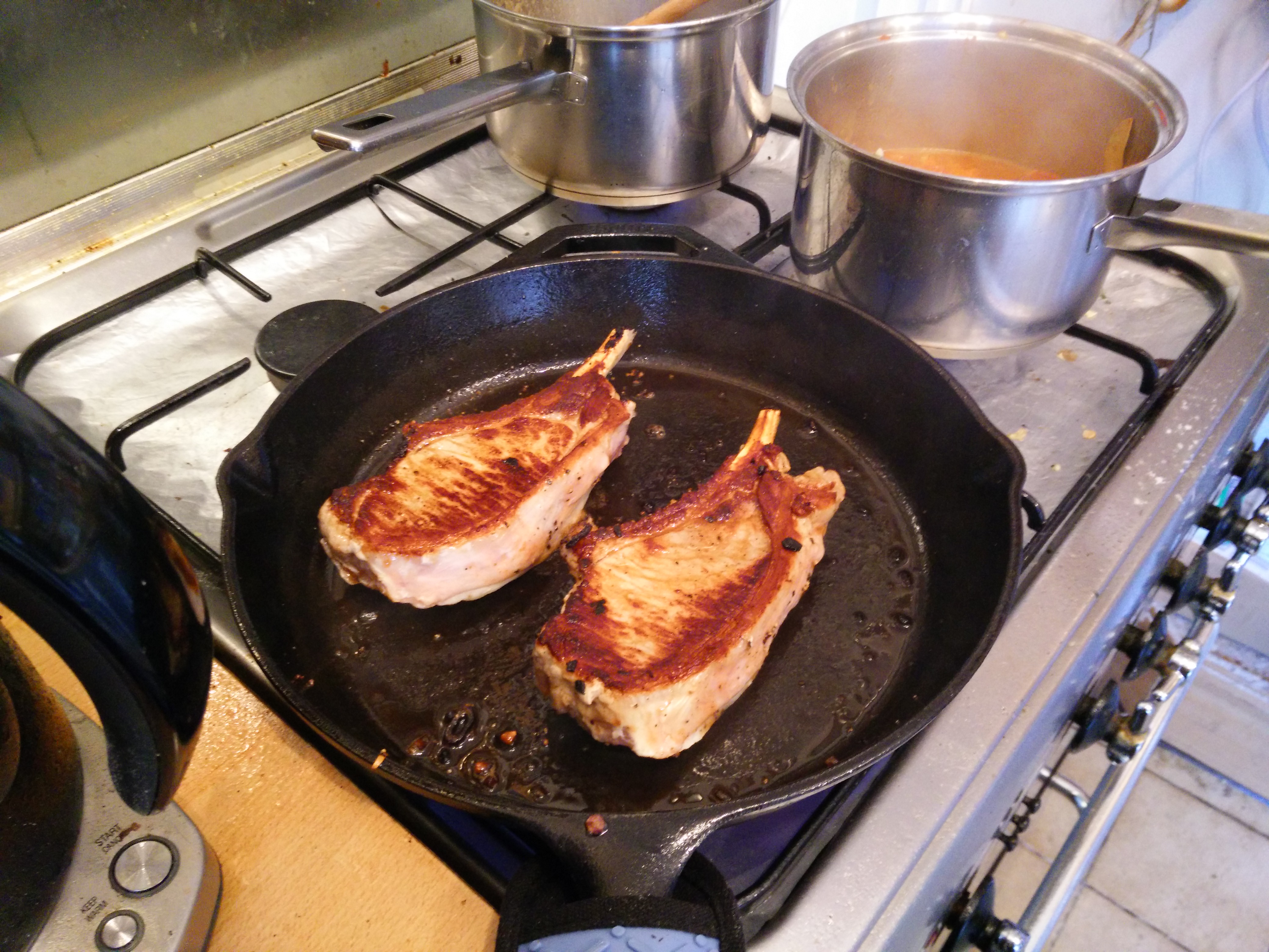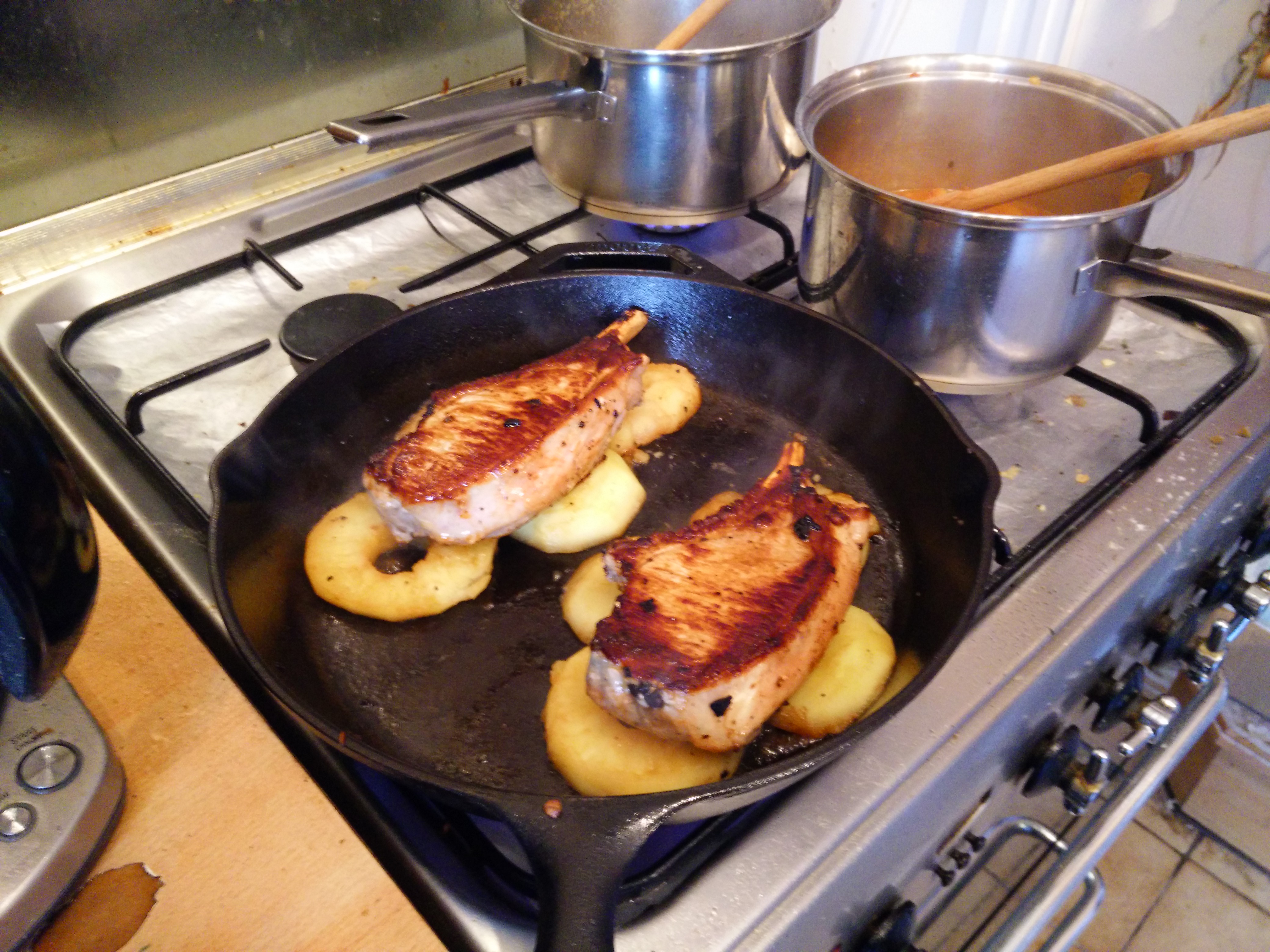 I’ve never been much good at cooking chops so I was going to ask you how long you cooked yours, but then I noticed that you did them part in the frypan, then finished them off in the oven. I do either one or the other, never a combination.