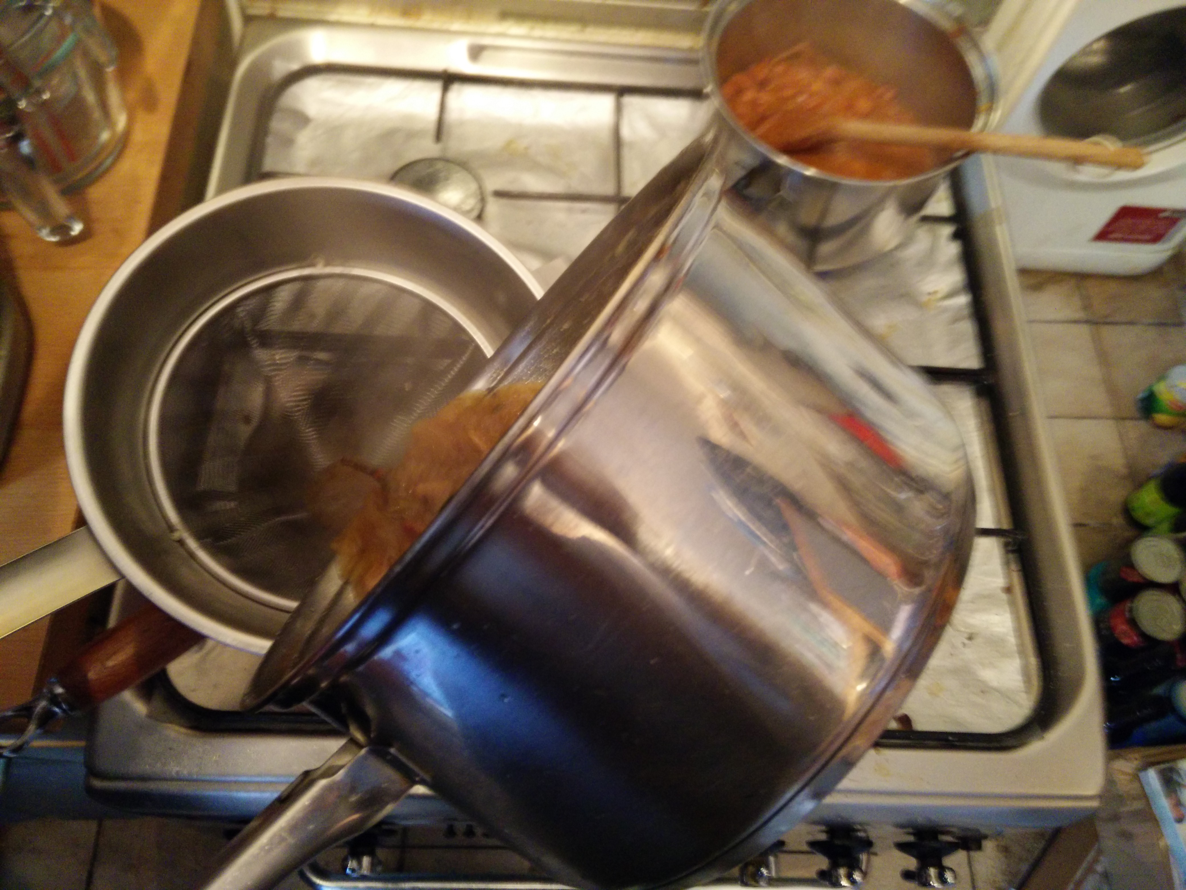 Sauce gets strained. Hehe… pan sauces, flambé, so chef! And now straining.