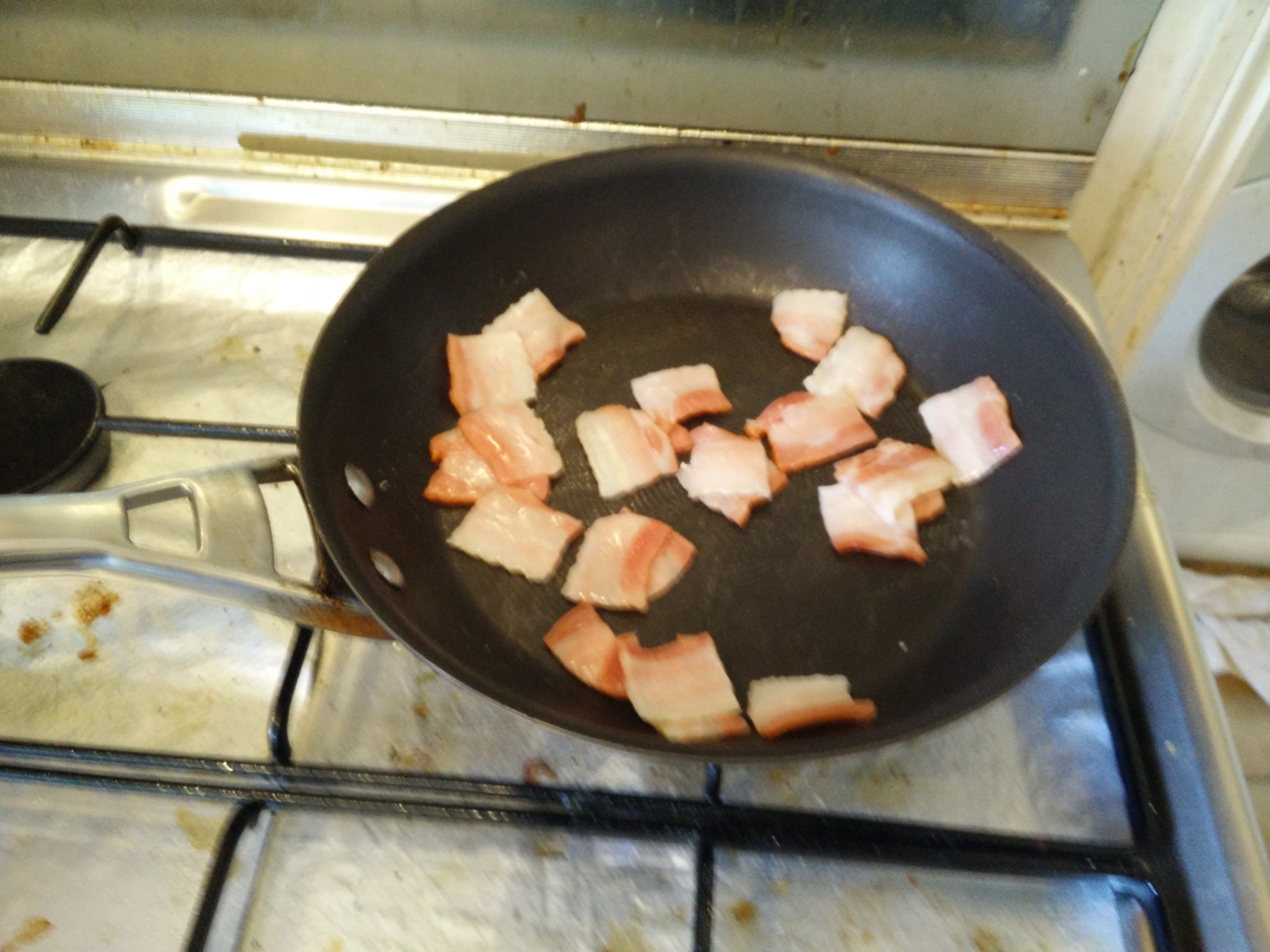 I’ll fry up some streaky bacon, then remove.