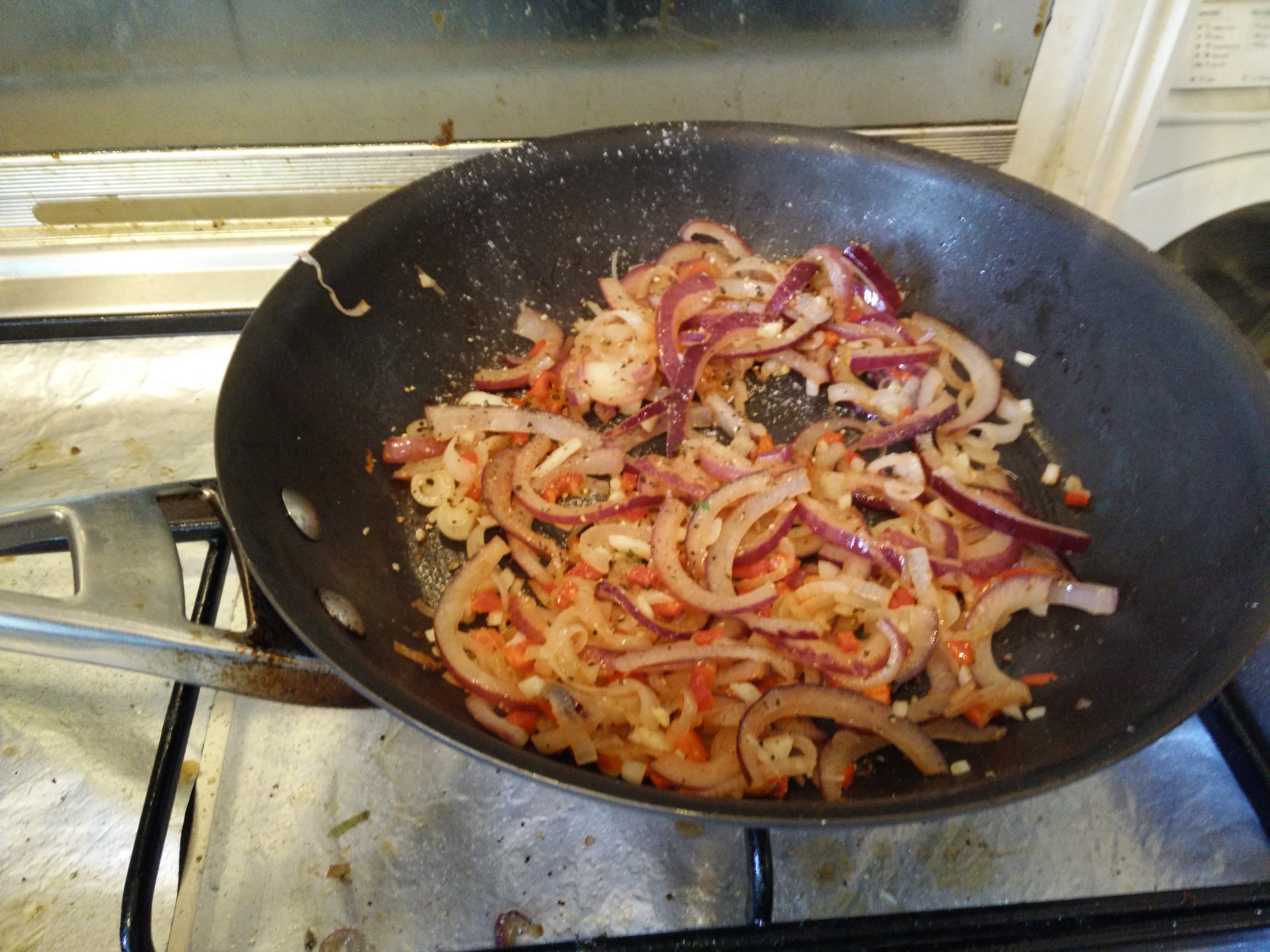 Then fry up onions, and add basil, chilli & garlic and season.