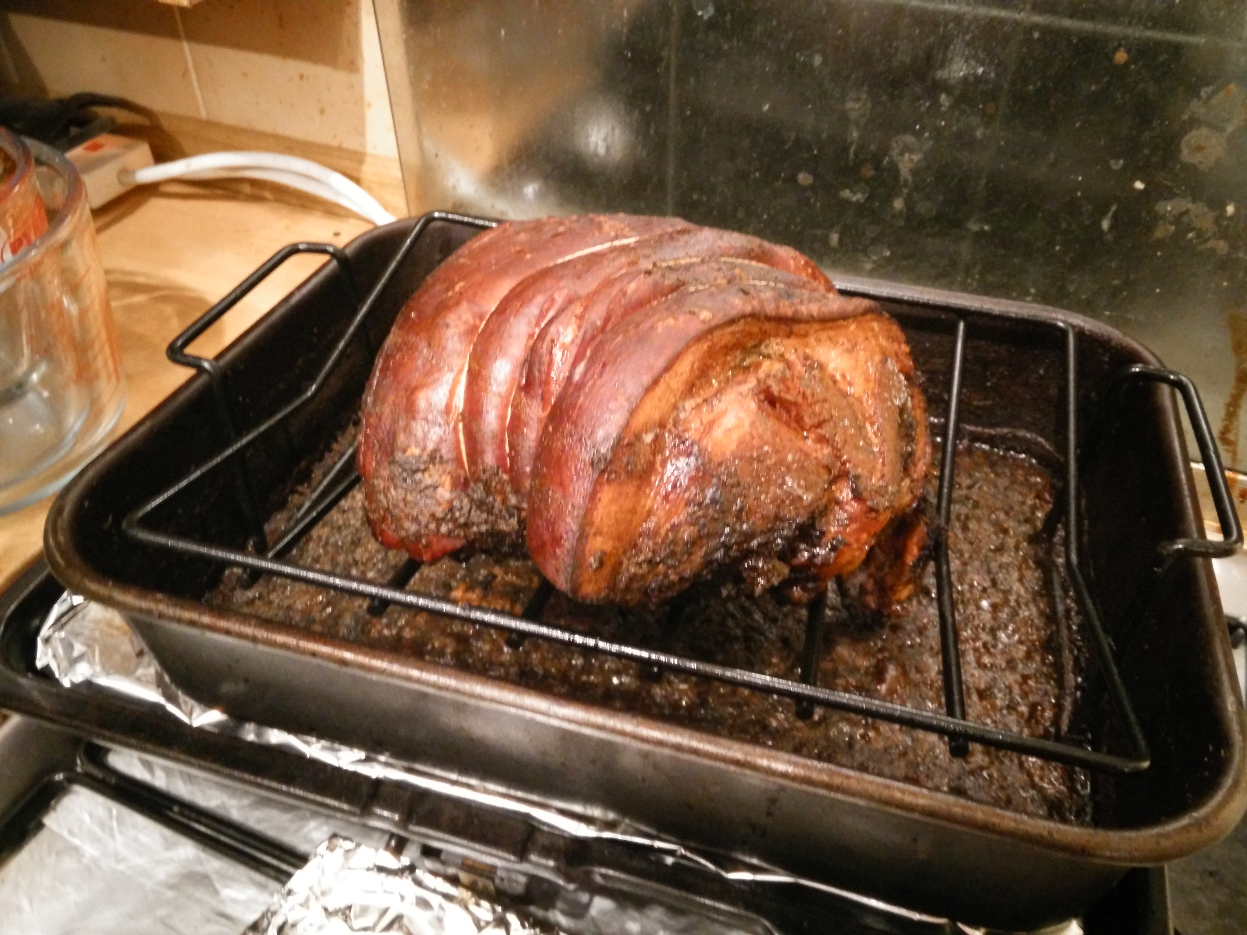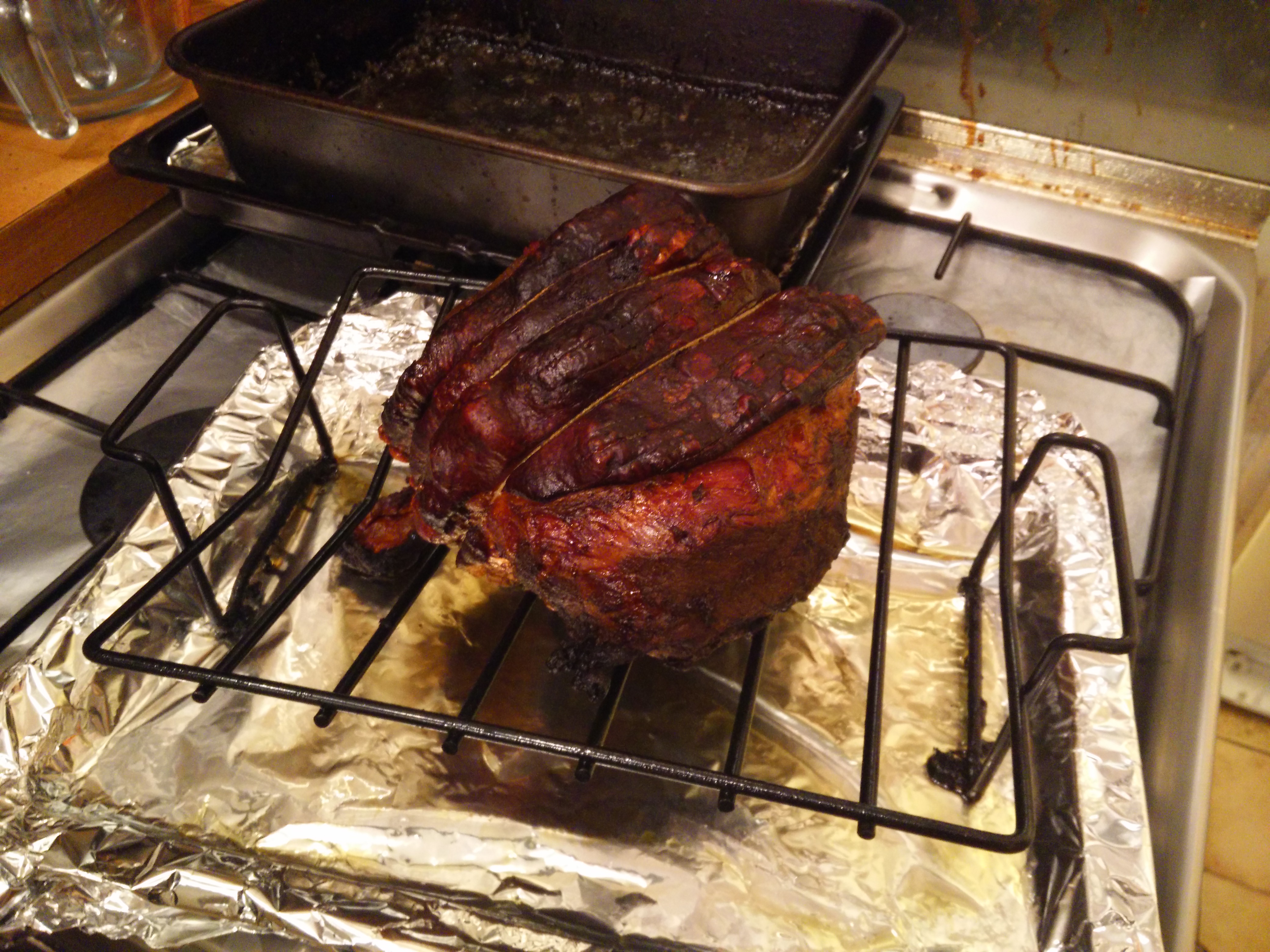 Then it’s wrapped in foil and into a 210C oven for 90 minutes. The the foil comes off for two and a half hours.