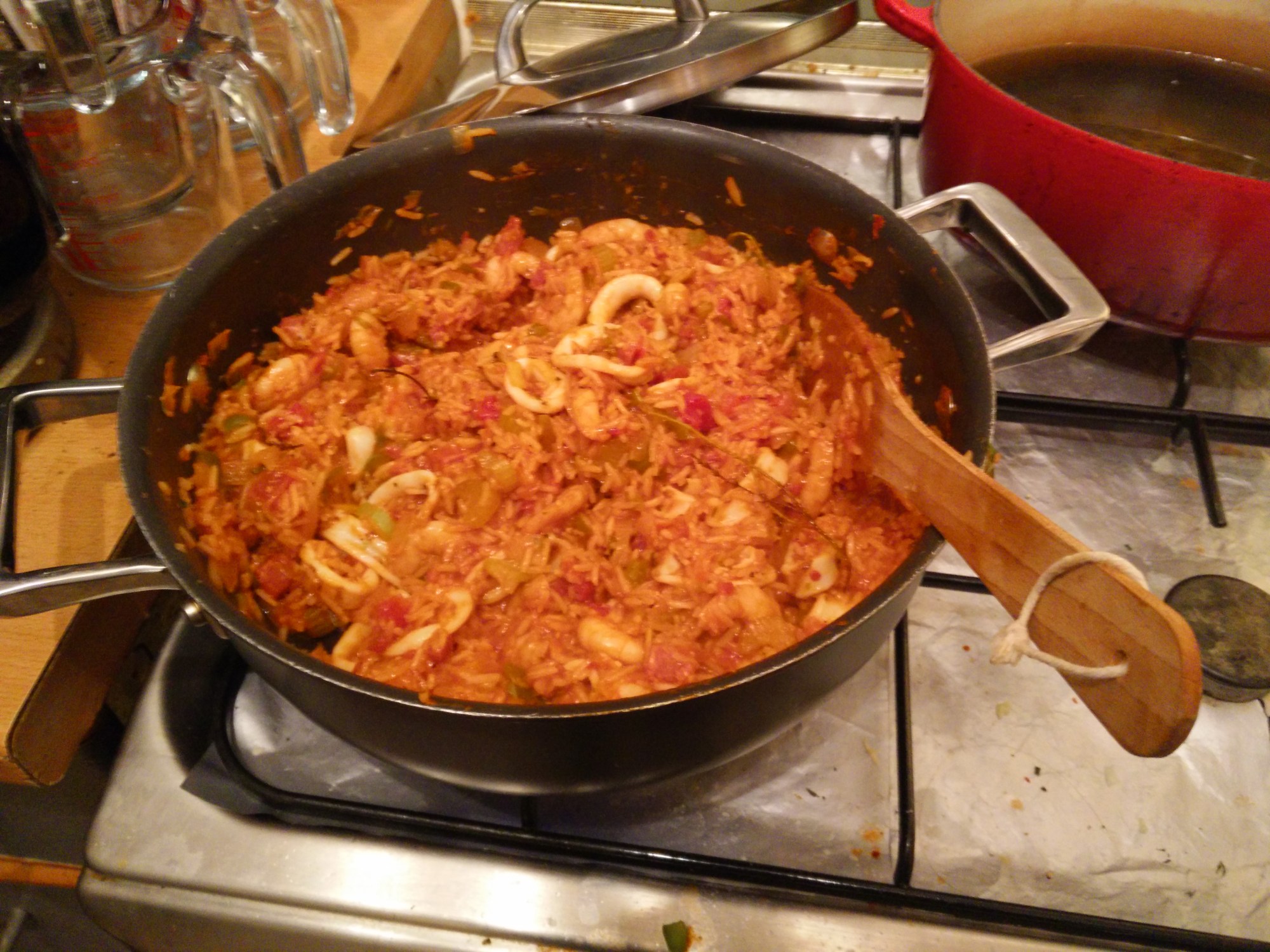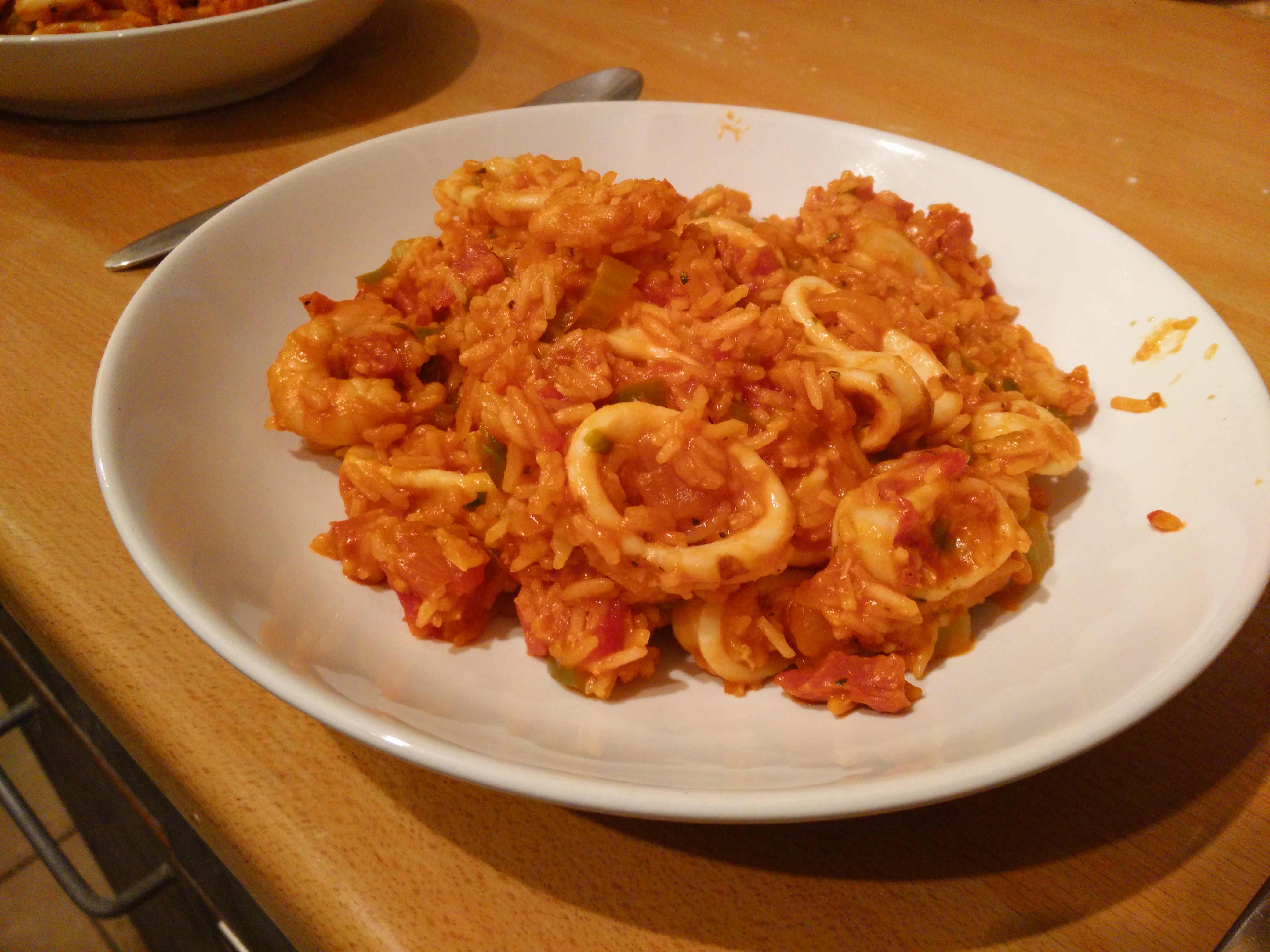 A nice one-pot meal using up some prawns and squid that were in the freezer, and using homemade veg stock from the freezer too. Recipe is just fry up veg & chorizo, add in tomatoes & stock, add rice and cook, then add prawns and squid to heat through.
