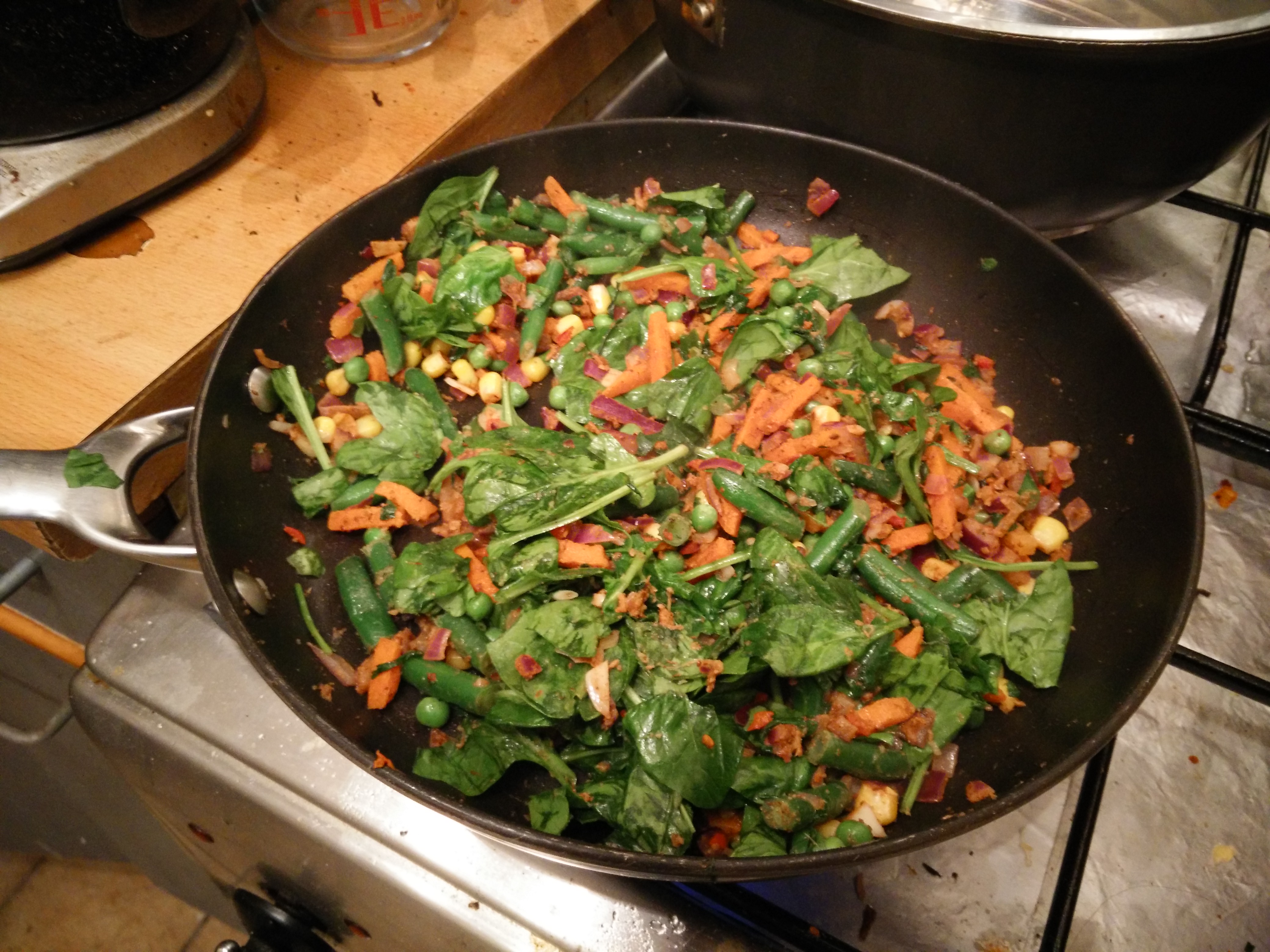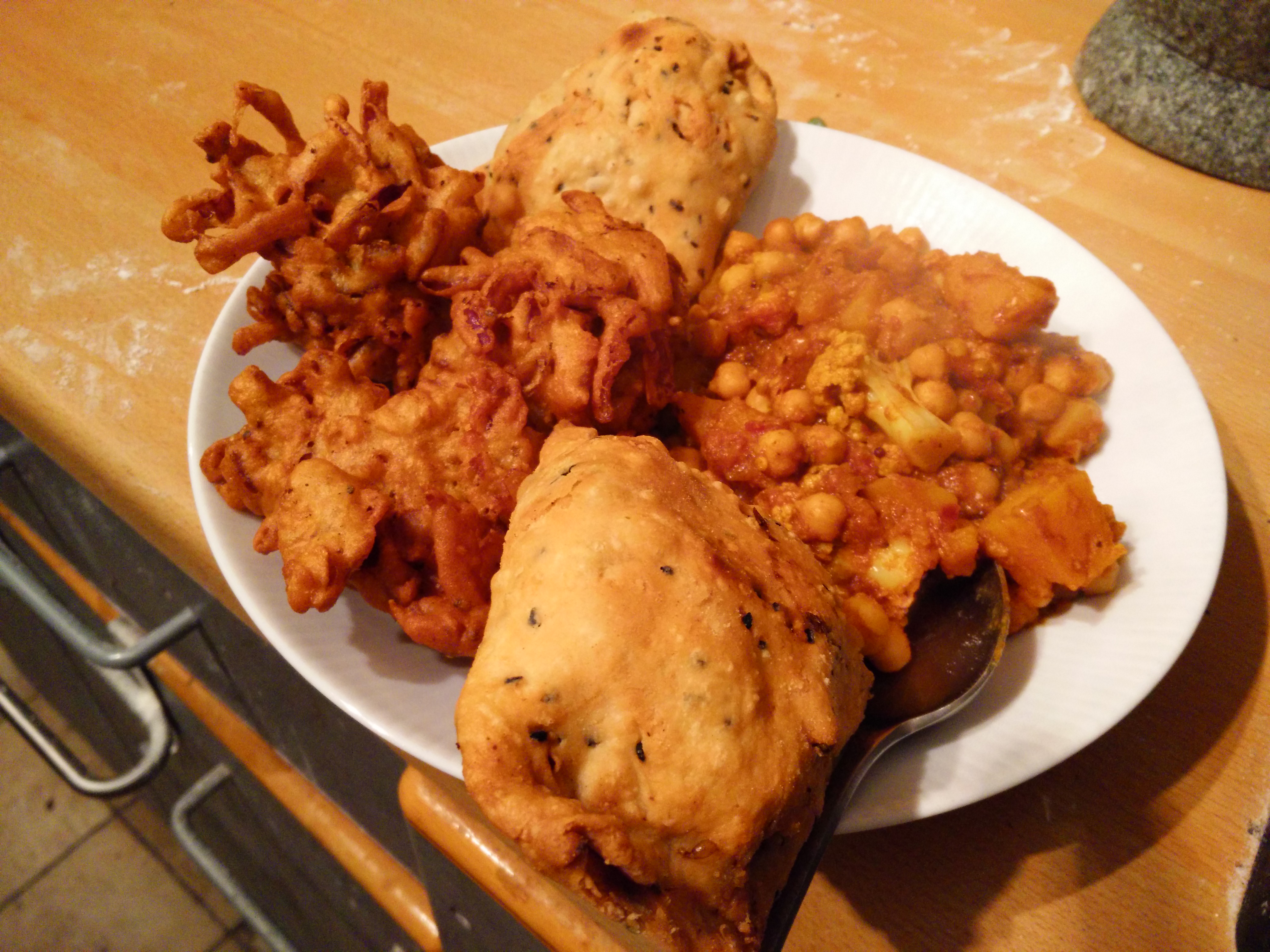 To go with Soph’s veg curry I made some deep-fried bhaji & samosa.