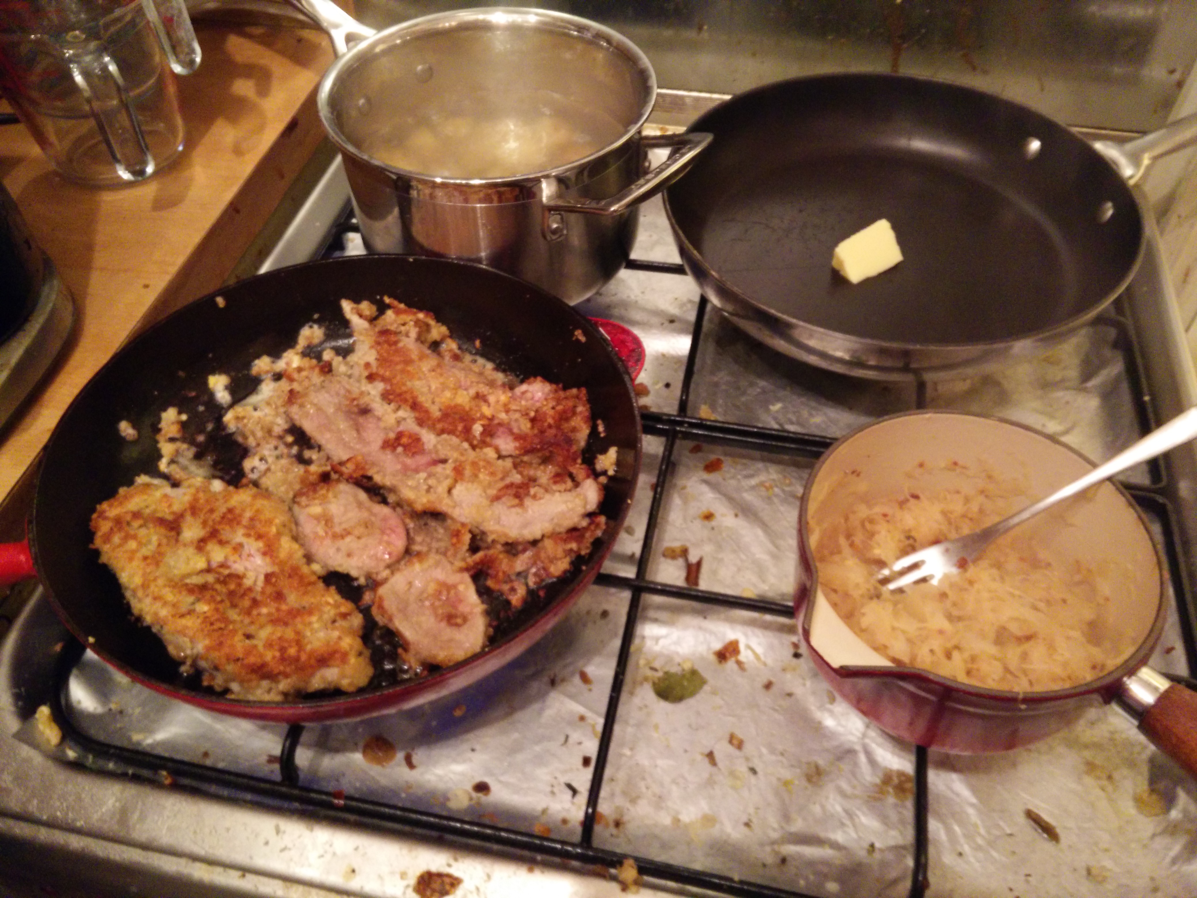 So it’s veal, bashed into an even layer, with sourdough breadcrumbs, lemon zest, parmesan, chopped pine nuts, and seasoning; ready to go with eggs, cream, lemons and wine ready to join in.