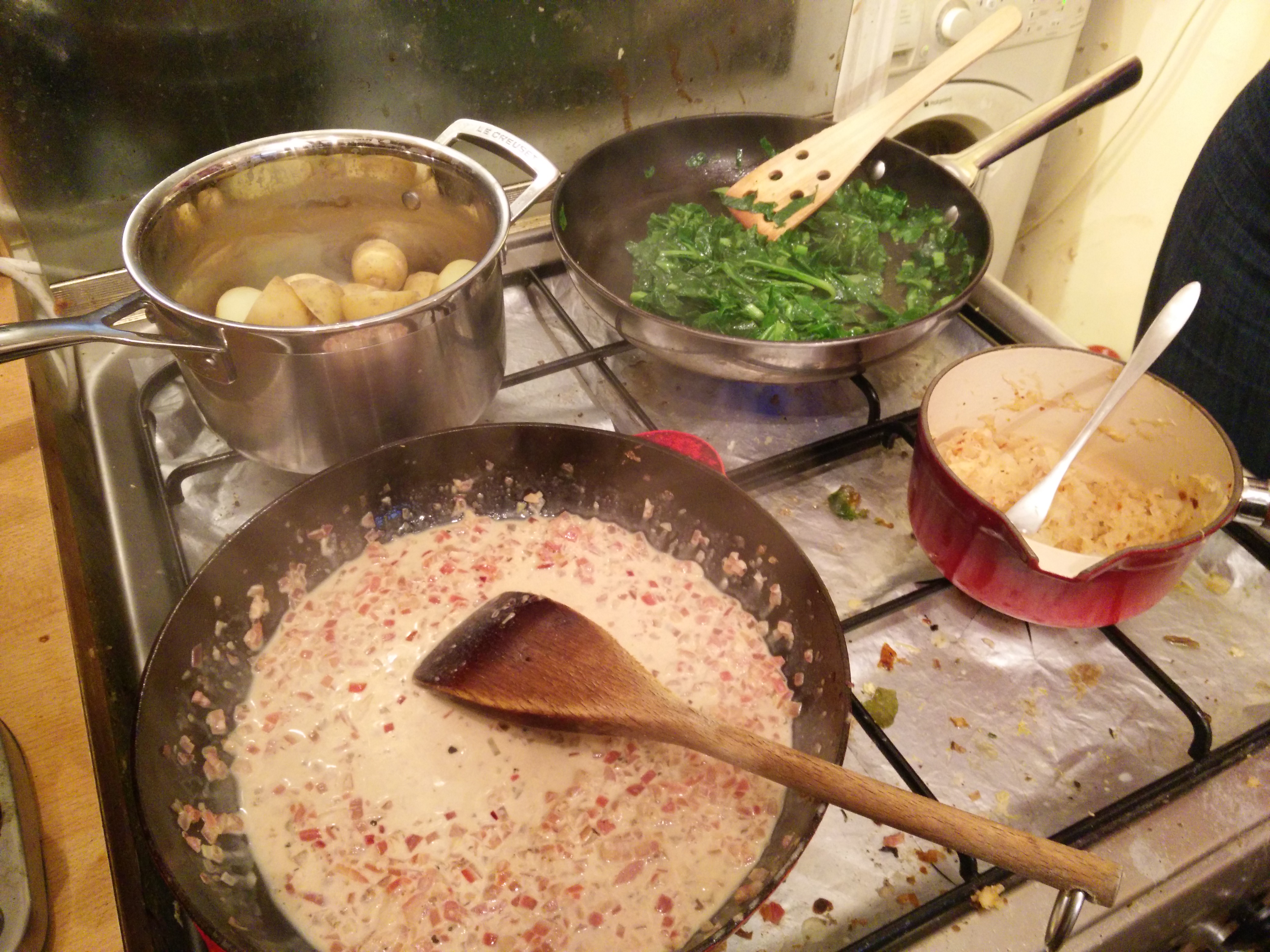 Potatoes need boiling, sauerkraut needs heating up, pans needs bacon cooking in to give us fat…