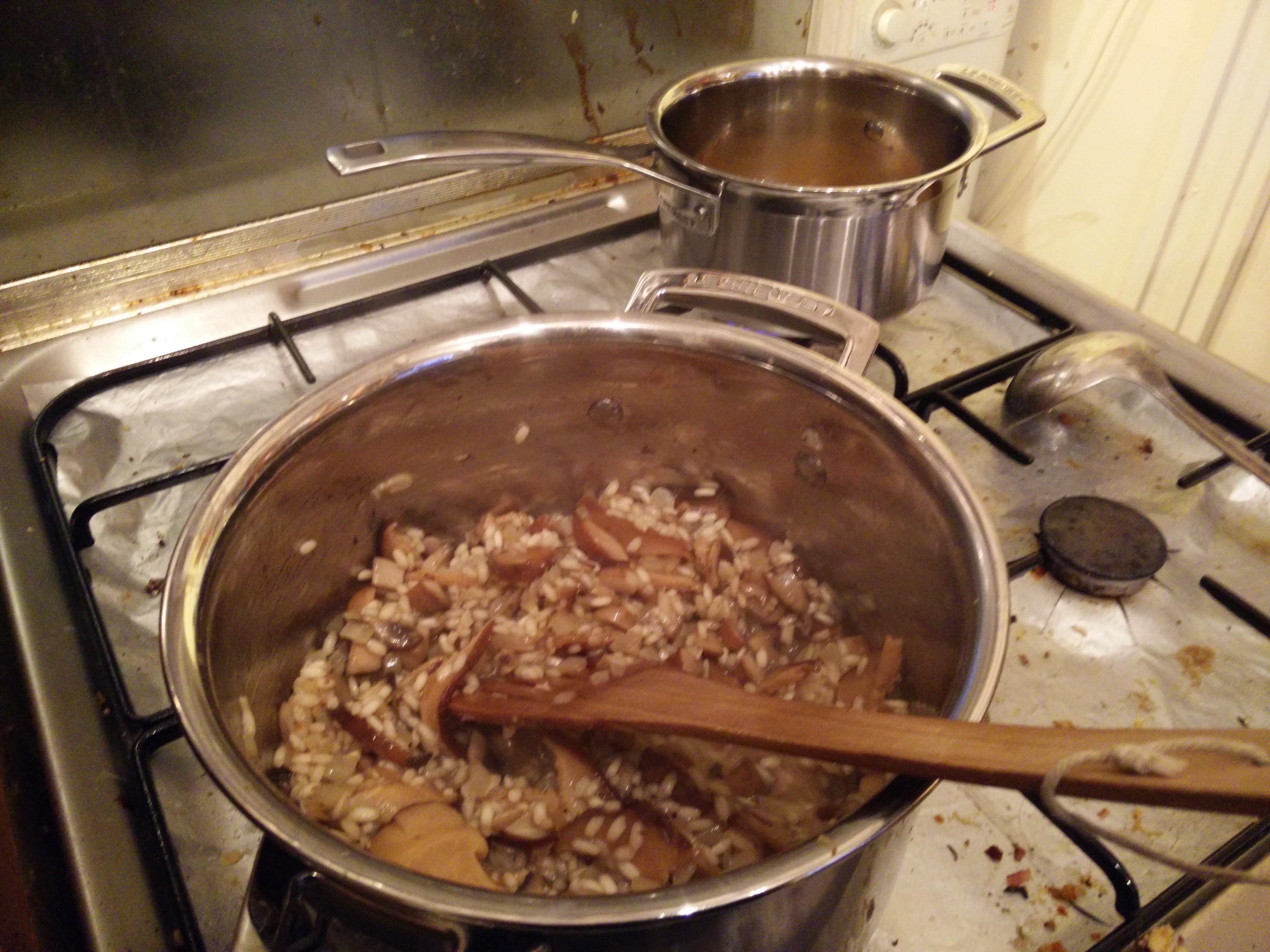 Then dried mushroom stock gets heated, and onion/garlic mix gets fried.