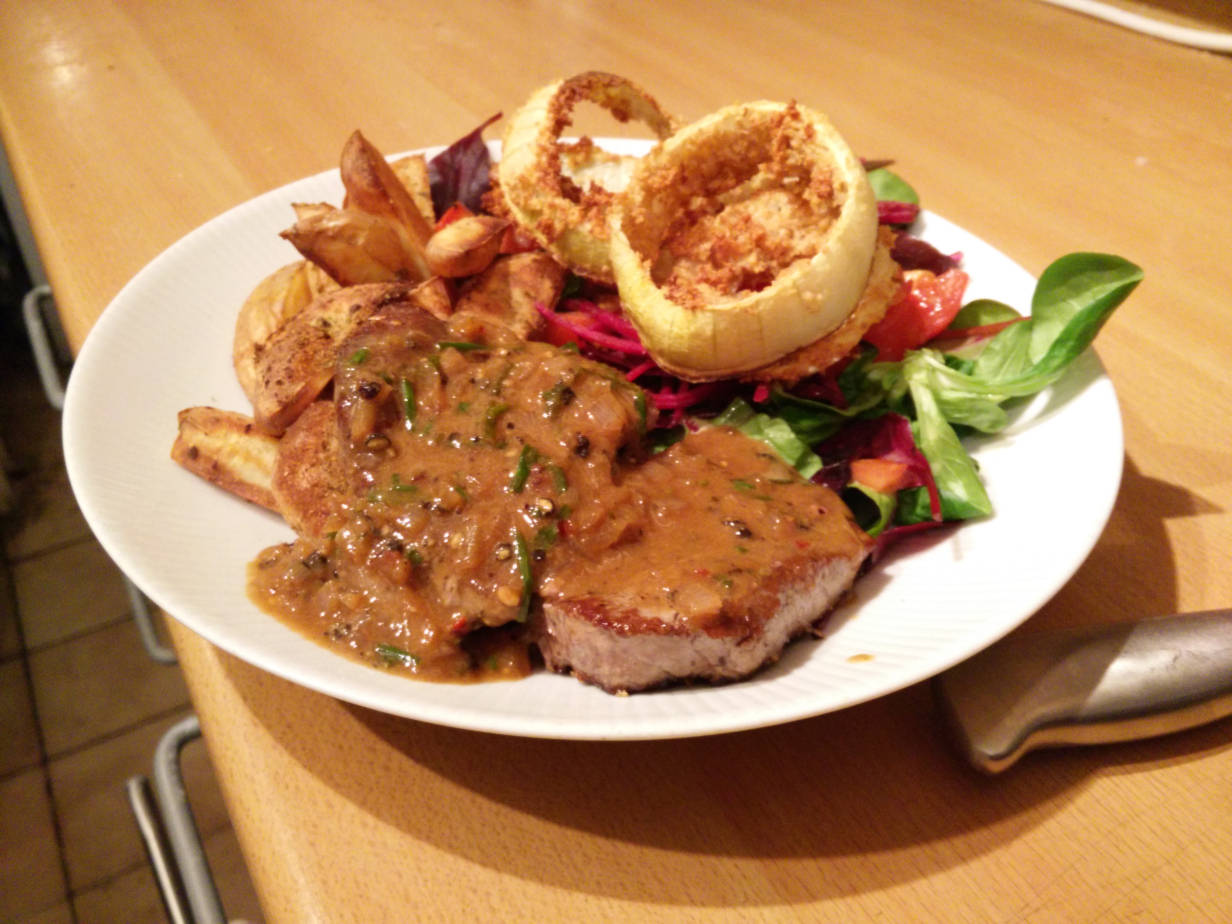 Yeah… this was amazing. Steak was rare, Soph’s dressing for the salad was lovely and spicy, sauce was hot and peppery, chips were crispy, onion rings were… well… baled onion rings with the occasional breadcrumb :)
