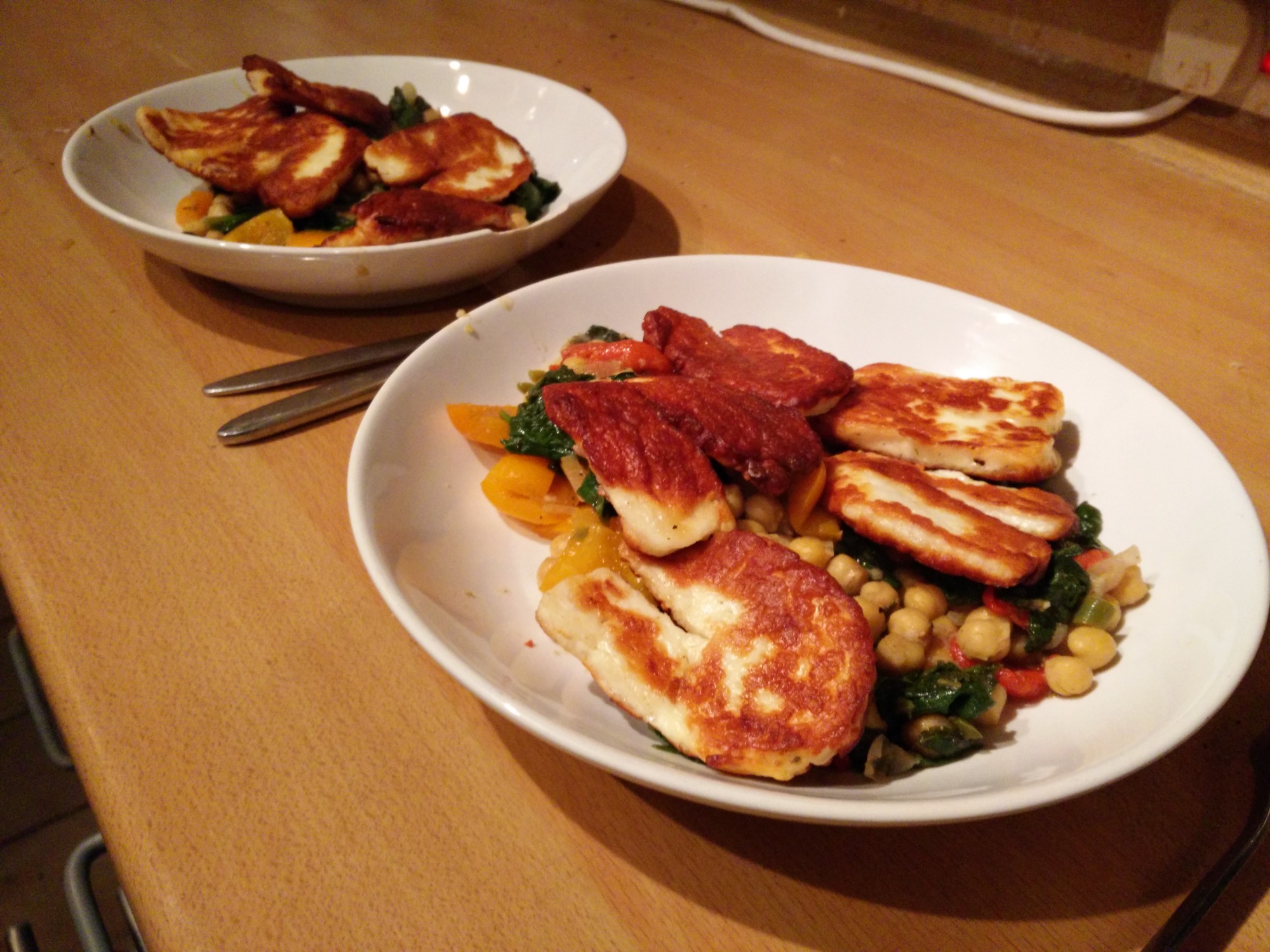 This BBC Good Food recipe takes advantage of the lack of melting to fry up the halloumi and give it some colour. It’s then served on a bed of spiced chickpeas. However they’ve done the spices wrong: where’s the Garlic? Where’s the cumin and coriander!? I shall have to add those myself.