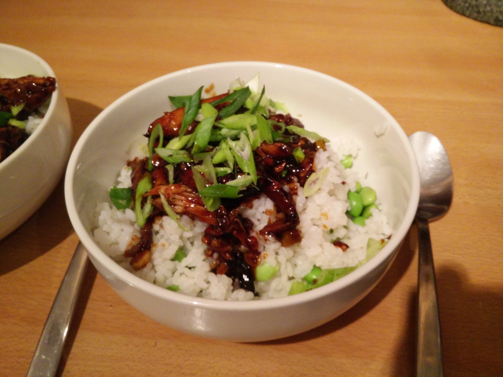 This barely counts as cooking. Make the rice according to the packet instructions, meanwhile sear the mackerel then cover in teriyaki sauce, add frozen soya beans to to the rice when it’s nearly done, serve with spring onions. Very nice donburi. And that’s it.
