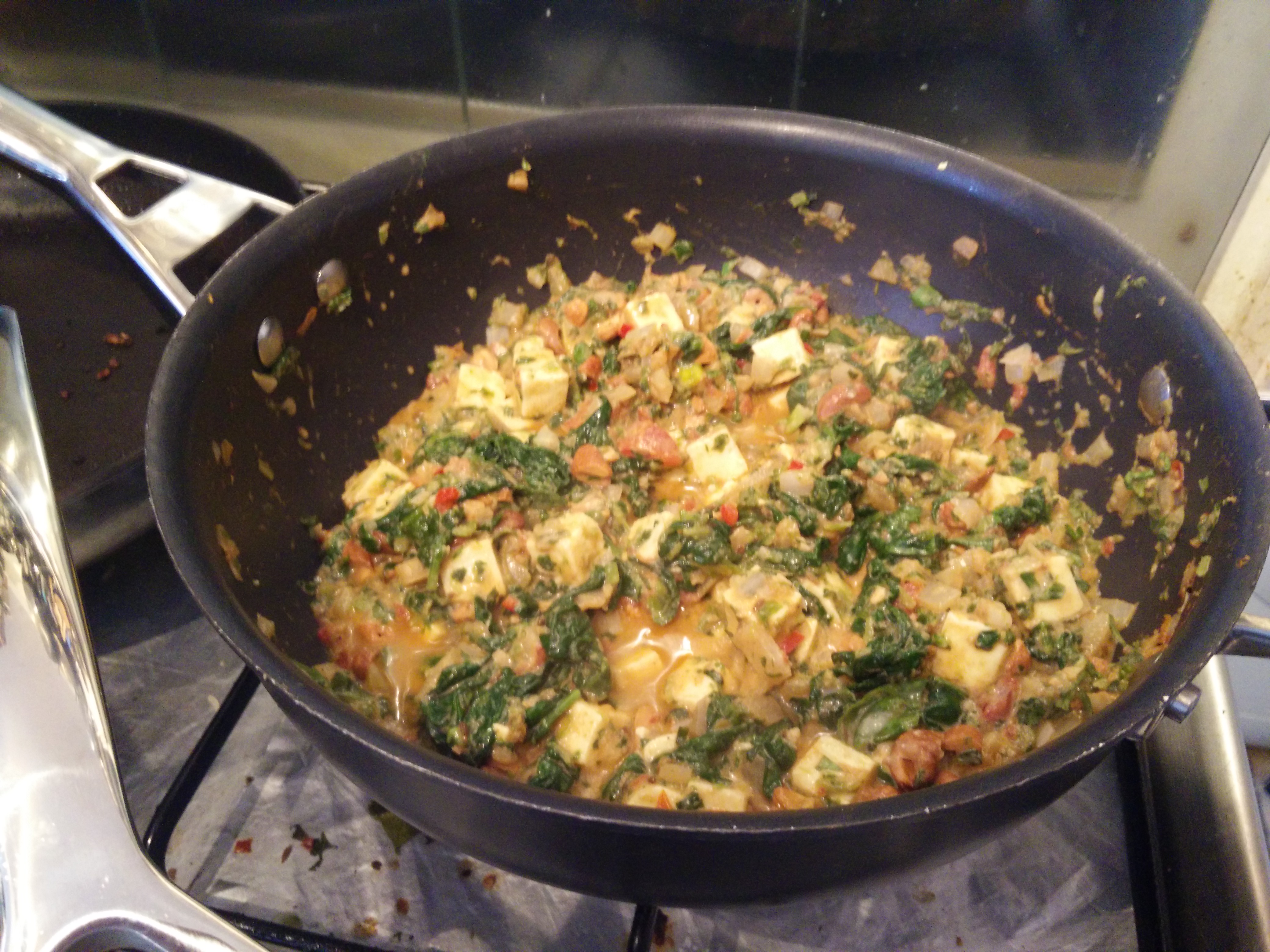 Saag paneer – or cheese and spinach, but with lots of extras, like tomatoes, coconut milk, roast cashews, etc.