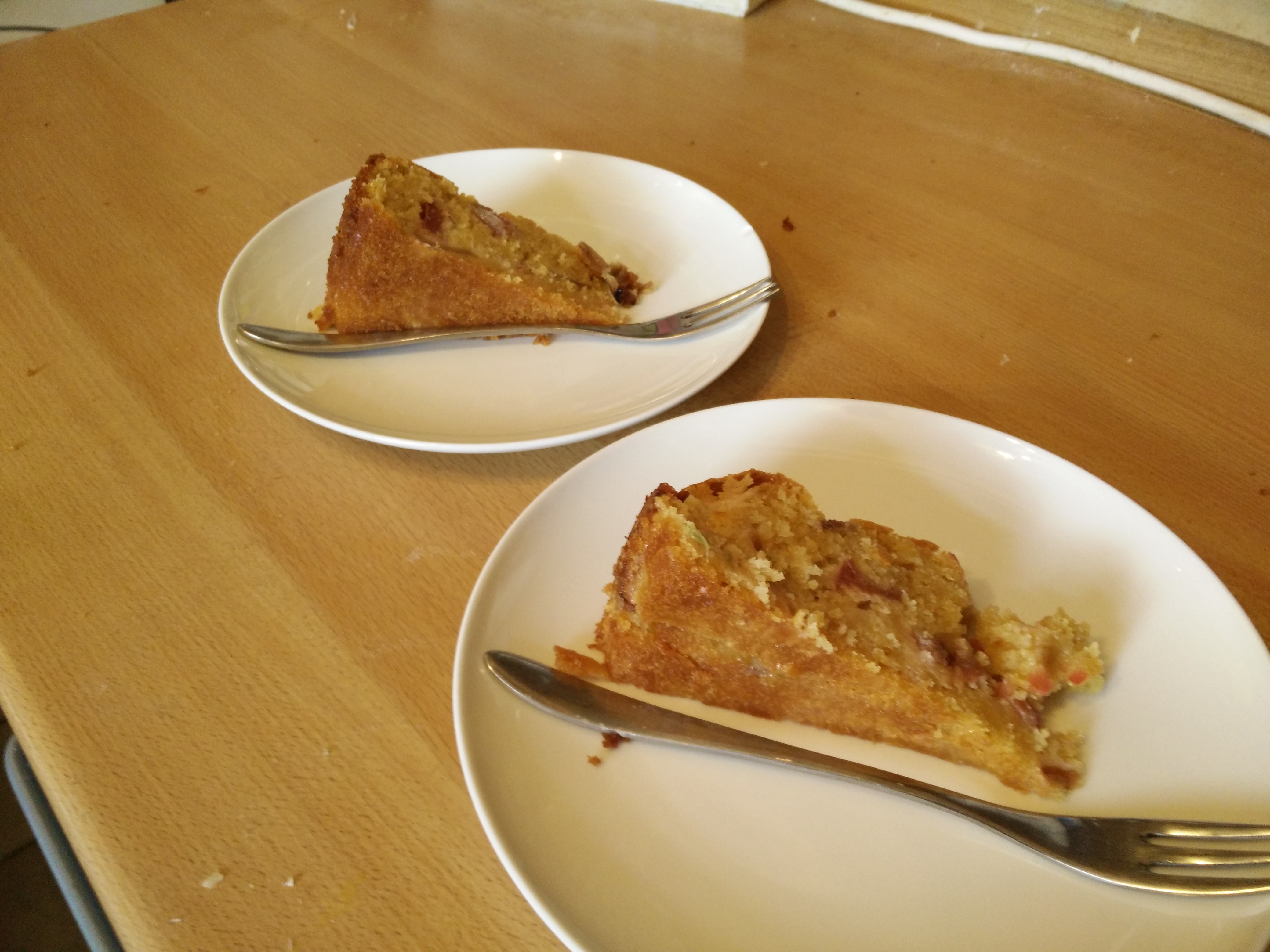 That is some delicious warm cake! Lovely and moist with nice sharp bits of rhubarb all the way through.