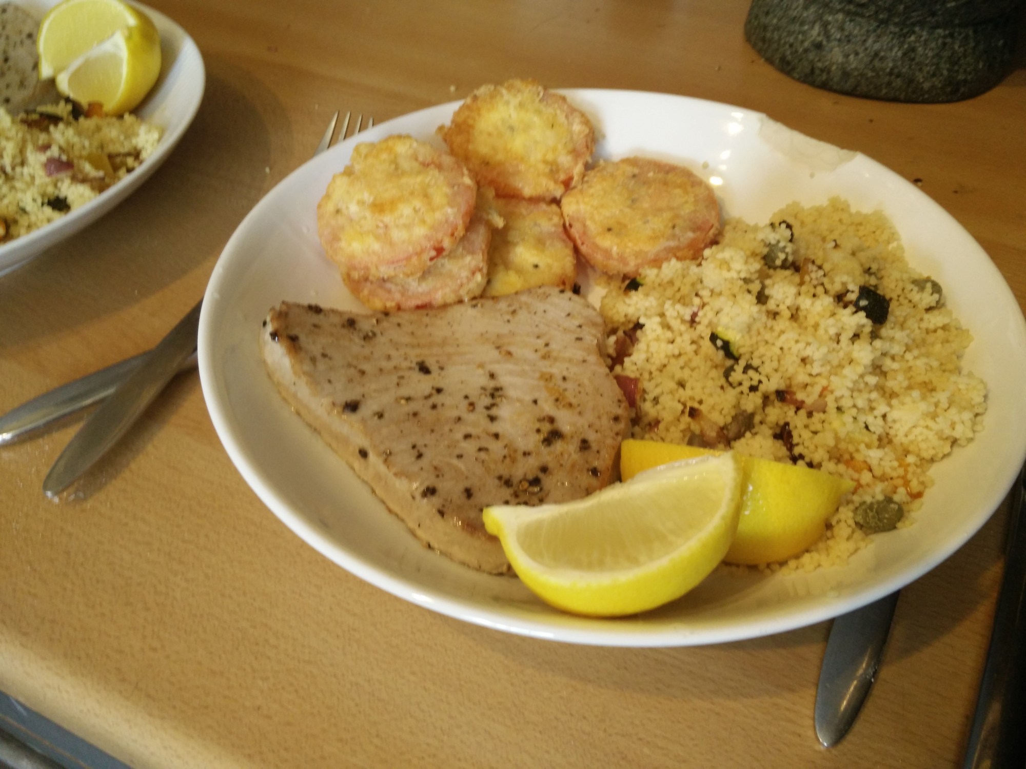Served with lemon wedges and we’ve got a not entirely unhealthy lunch! The tuna was so juicy – well worth doing this occasionally.