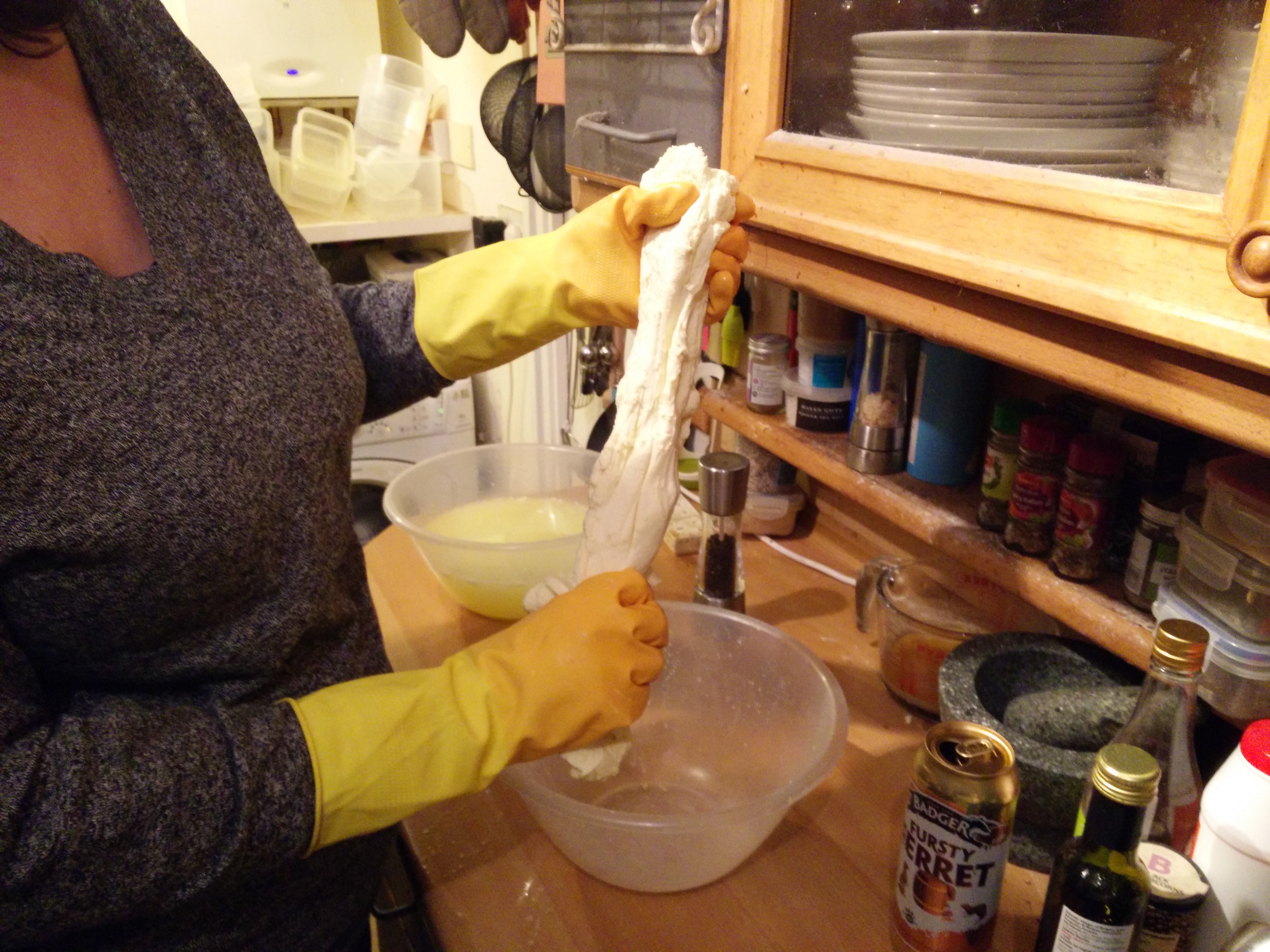 This gets heated to 32C before a vegetarian rennet substitute is added. This comes in tablet form, and just 1/4 of a tablet is dissolved in 50ml of cooled boiled water. It’s then left with the lid on.