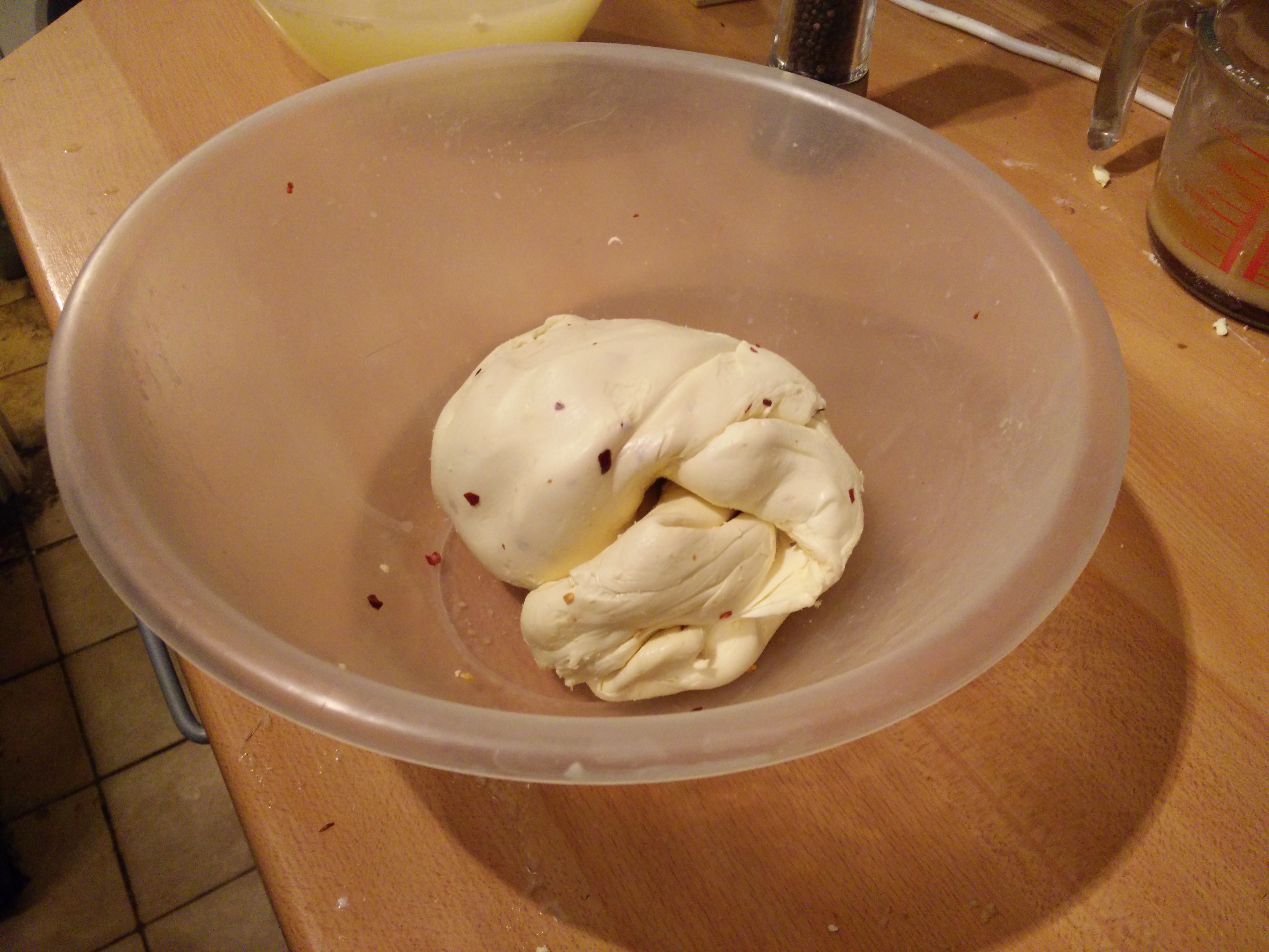 The mozzarella taste like mozzarella, but the texture is more like halloumi — hardish and not very stringy. I think we over-kneaded it as too low a temperature. Guess we’ll have to try it again!