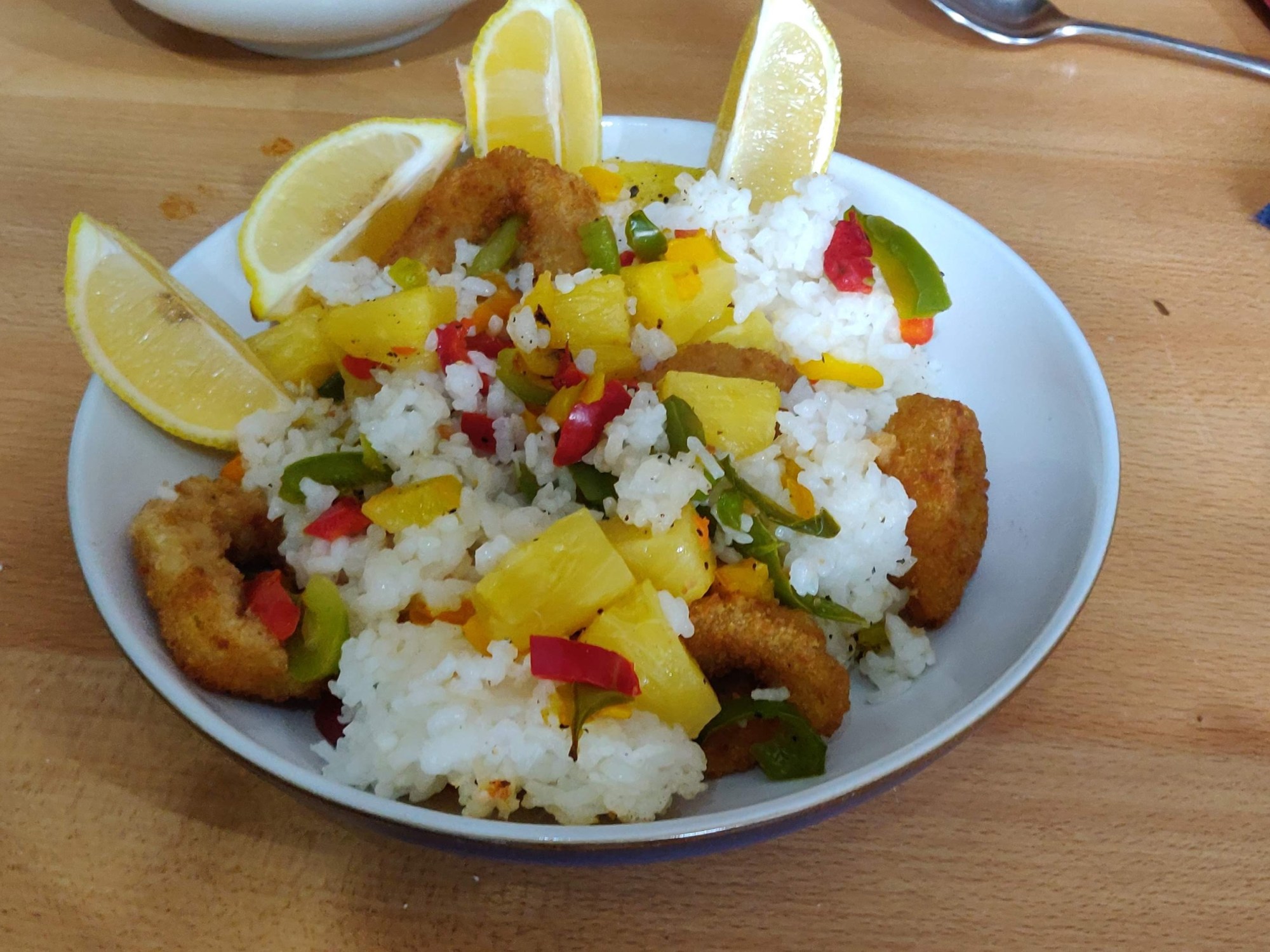 The veg, as I mentioned, is generally frozen: chopped peppers, mixed veg, peas, whatever is already open in the freezer. Tonight you’ll see from the picture that there’s also tinned pineapple in there too, which adds a nice freshness to things.