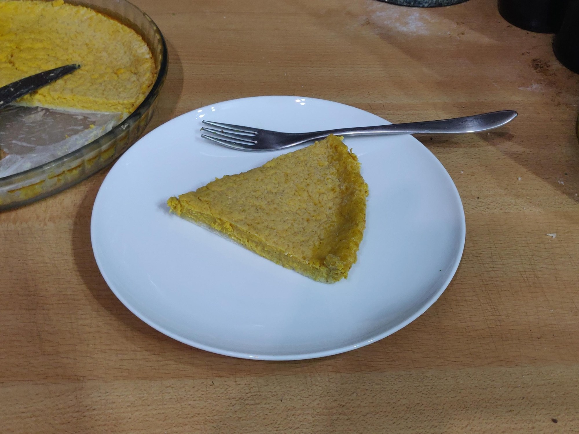 Into the tart dish, with the Lo-Dough on the bottom. And into the oven at 160C fan (supposed to be 140C but I don’t trust low temperatures) for 40mins, and even at the higher temperature I’m not convinced it will be set…