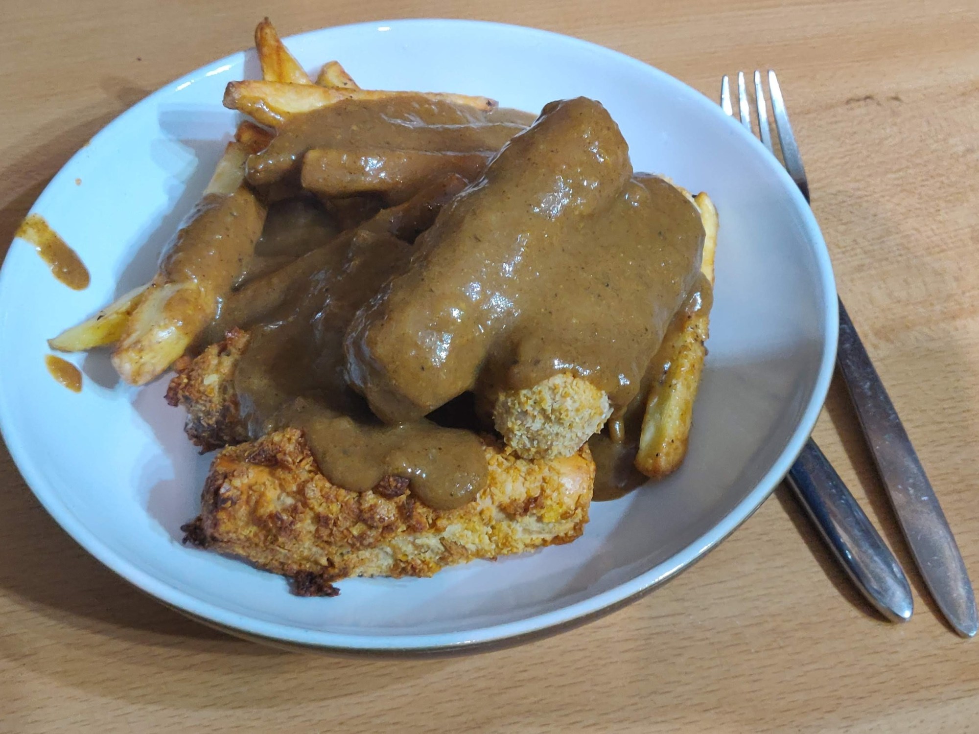 Following on from our recent Chinese Fakeaway, I’m doing a fake Chinese chip-shop dish of ours: battered sausage, chips & curry sauce.