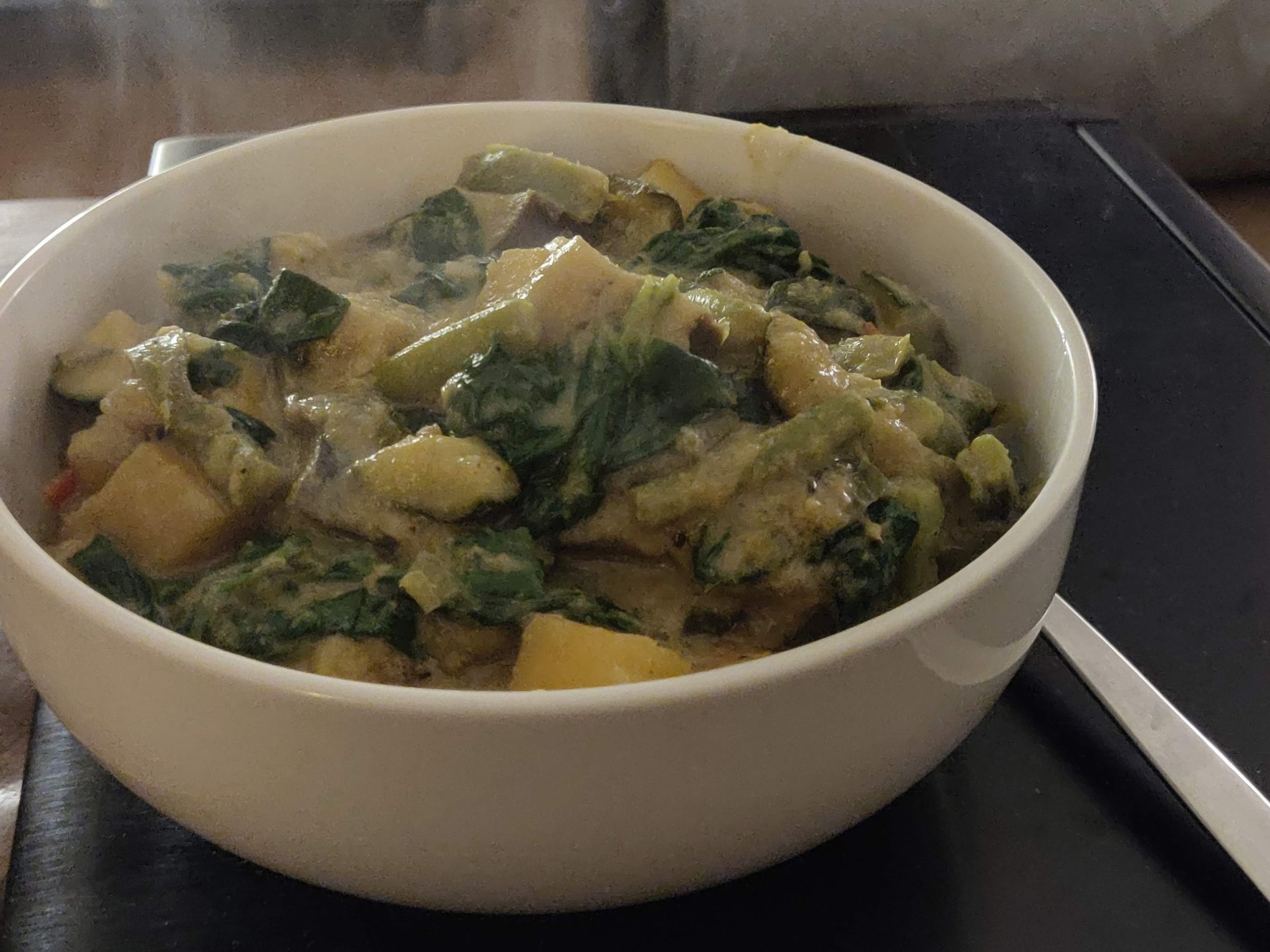 One of those items was Thai green curry paste, the basis of the ever popular pub food Thai Green Chicken Curry. However in my ongoing project of eating less meat, I decided to go veggy: it’s all about the green curry flavour anyway!