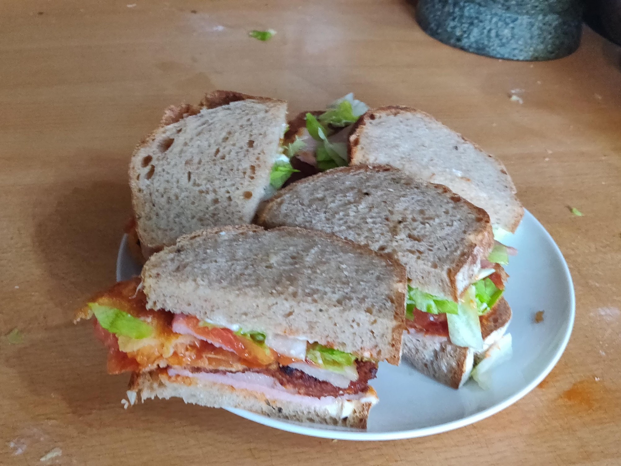 Then assembling, half the lettuce going on the floor… resulting in some rather unstable sandwiches!